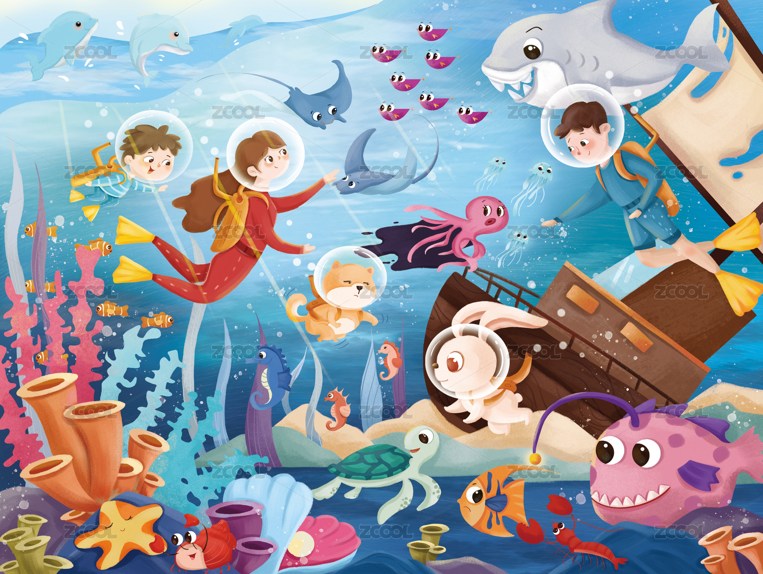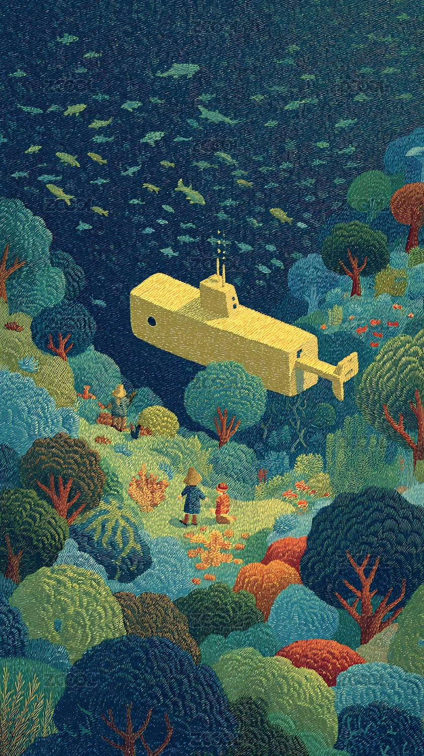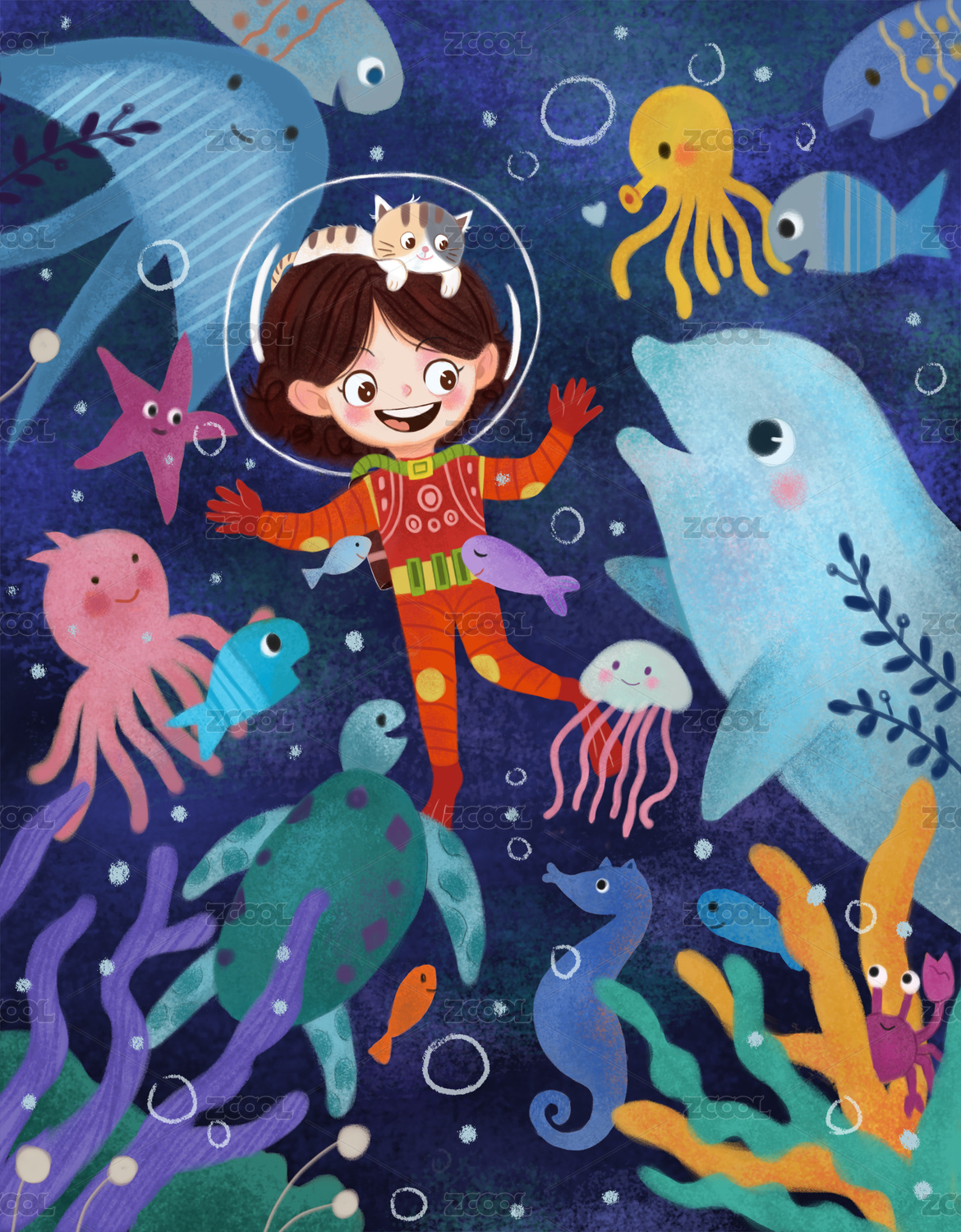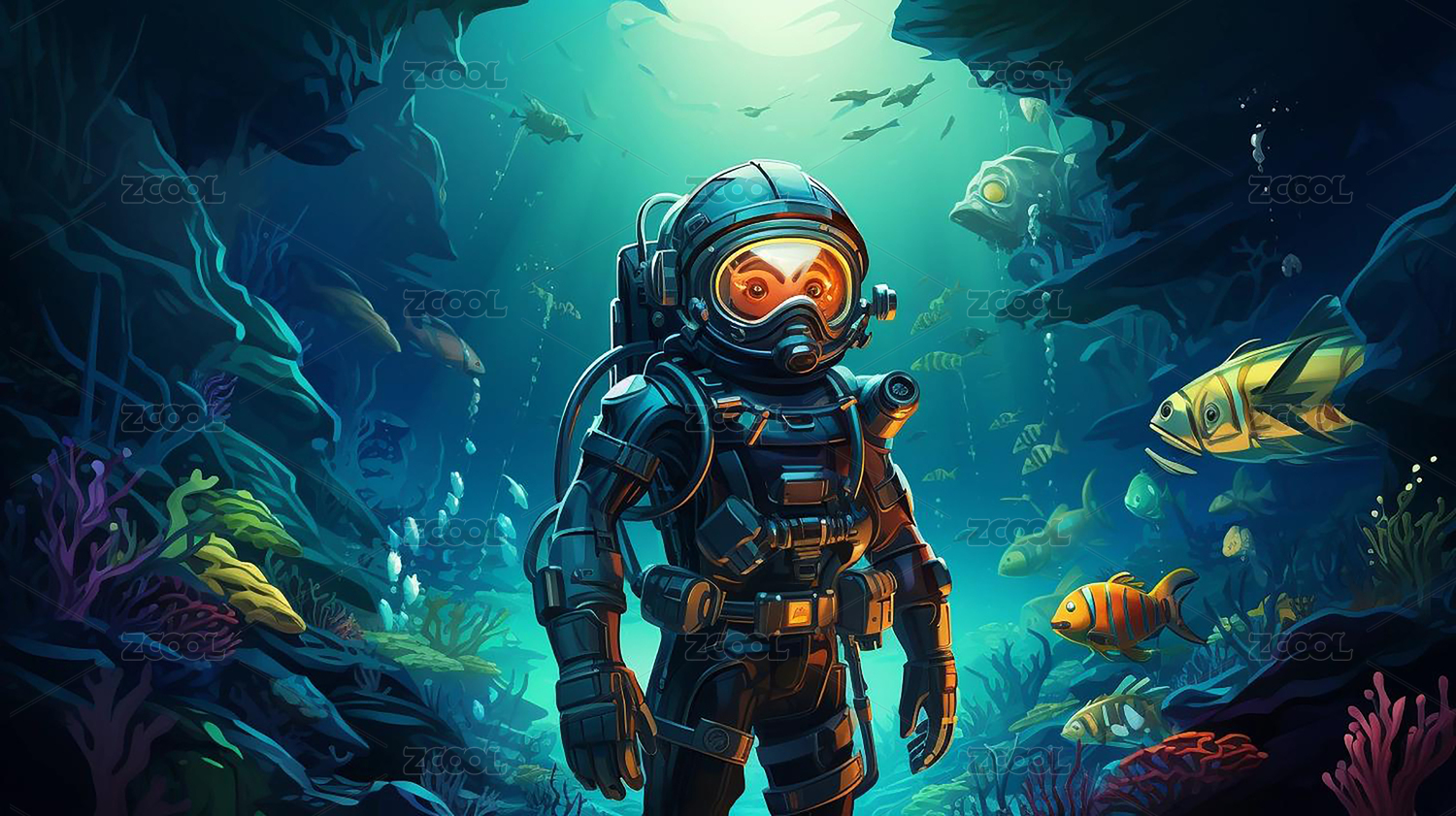 神秘的海底機器場景設(shè)定,海底世界插畫。