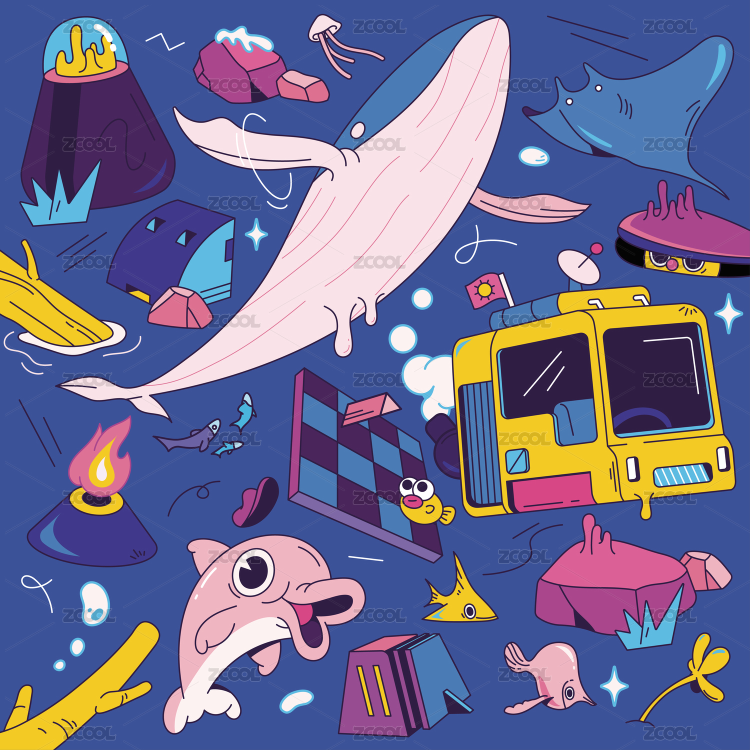 海底探險海豚鯨魚古遺跡矢量扁平插畫元素