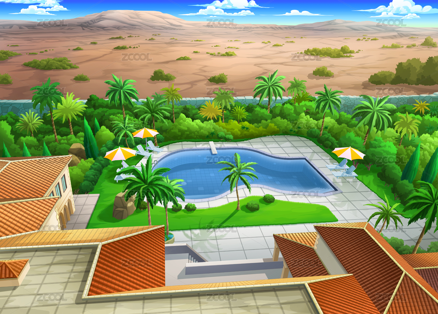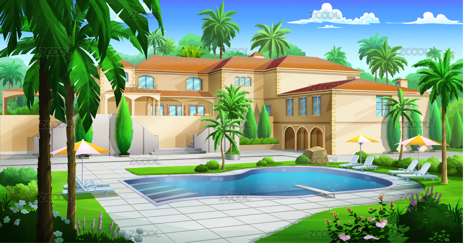 歐美風(fēng)家庭后院夏日泳池場(chǎng)景