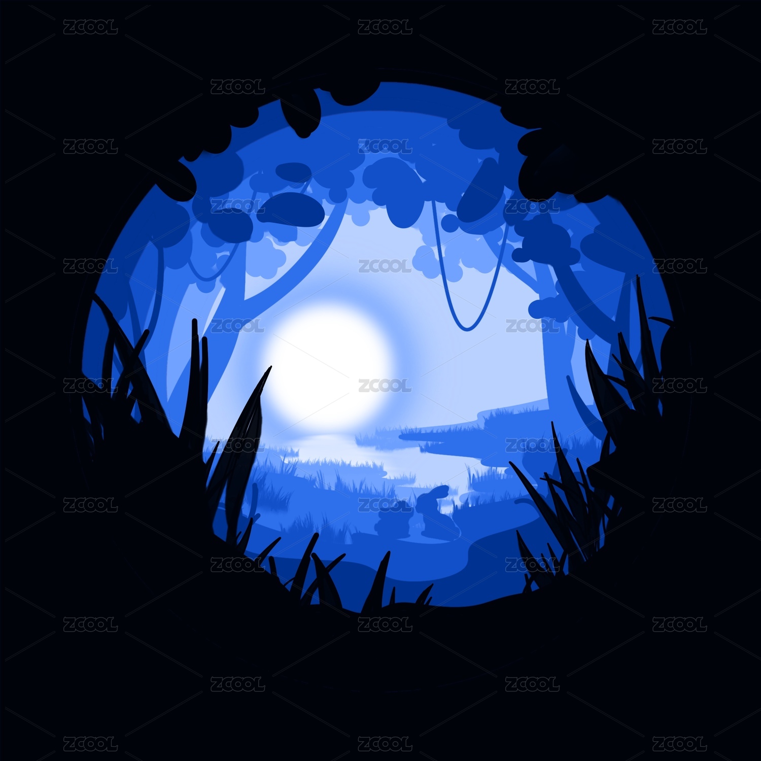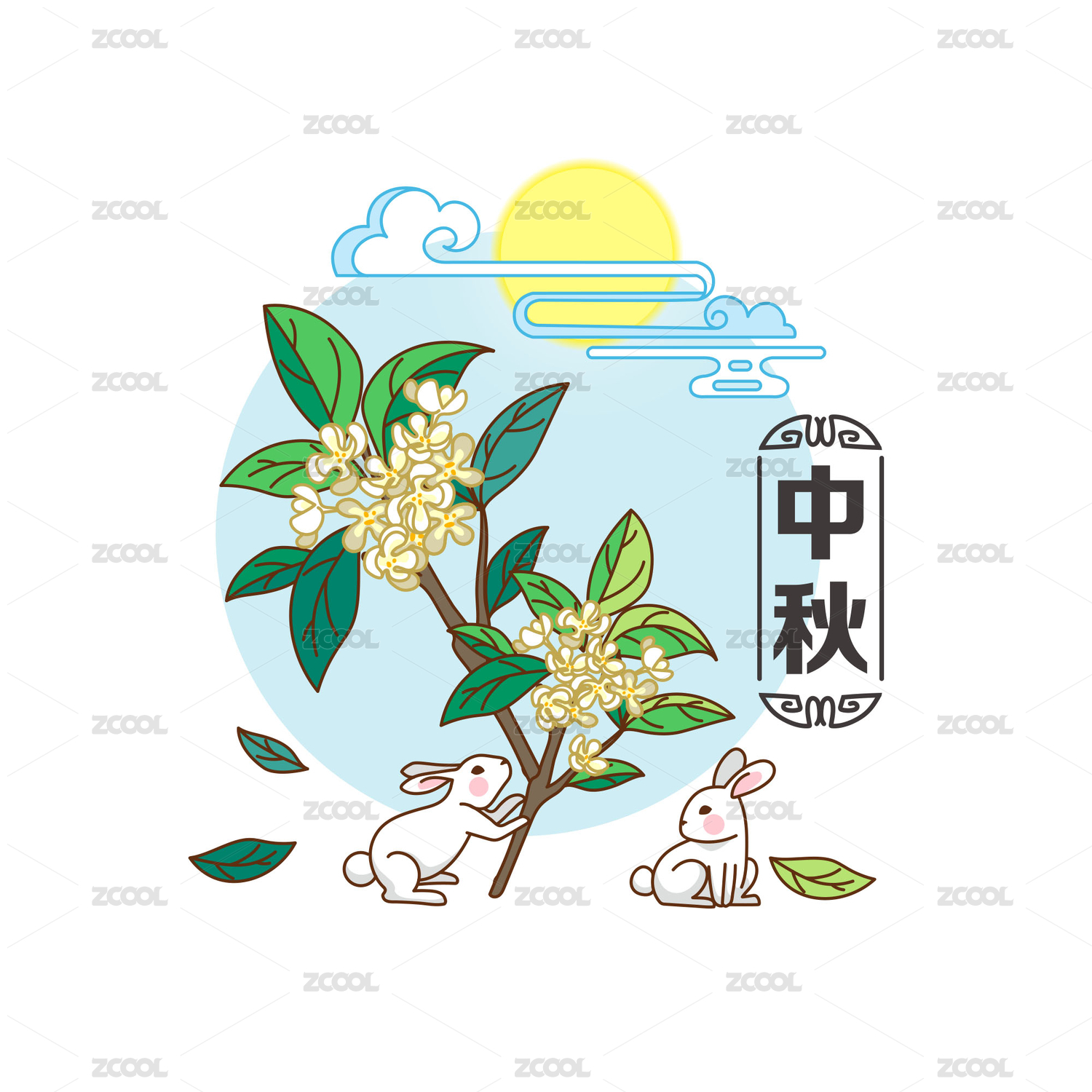 中秋節(jié)傳統(tǒng)節(jié)日矢量插圖:桂花、玉桂樹、小兔子、月光、圓月、賞月