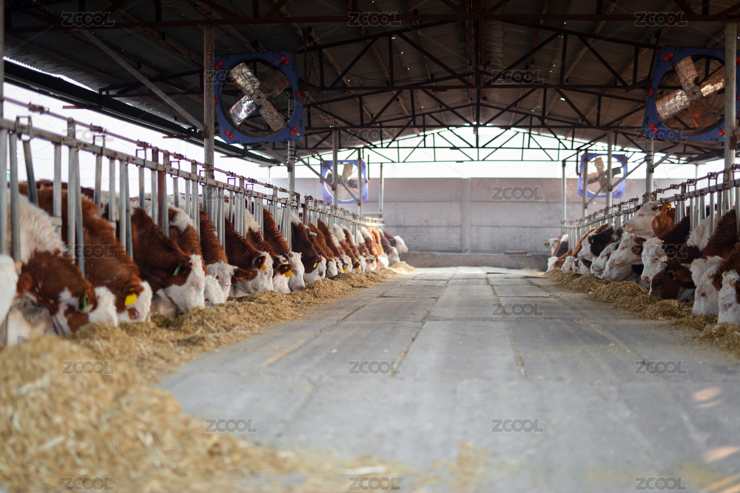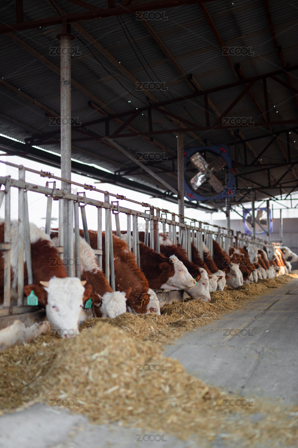 養(yǎng)殖場(chǎng)里的牛正在吃草料