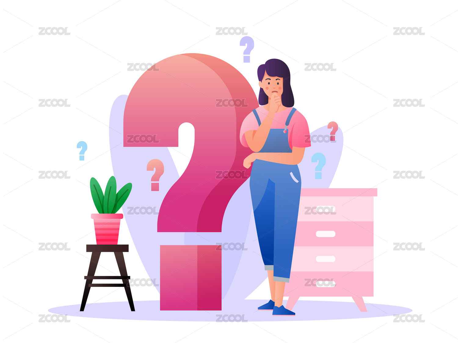 女生倚靠問(wèn)號(hào)矢量扁平插畫