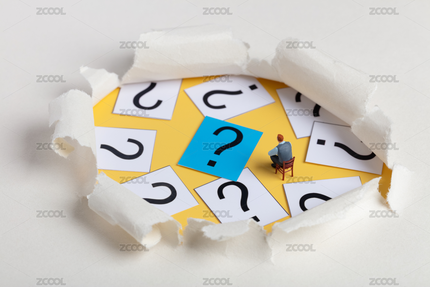 微縮創(chuàng)意問(wèn)號(hào)中坐著思考的男性