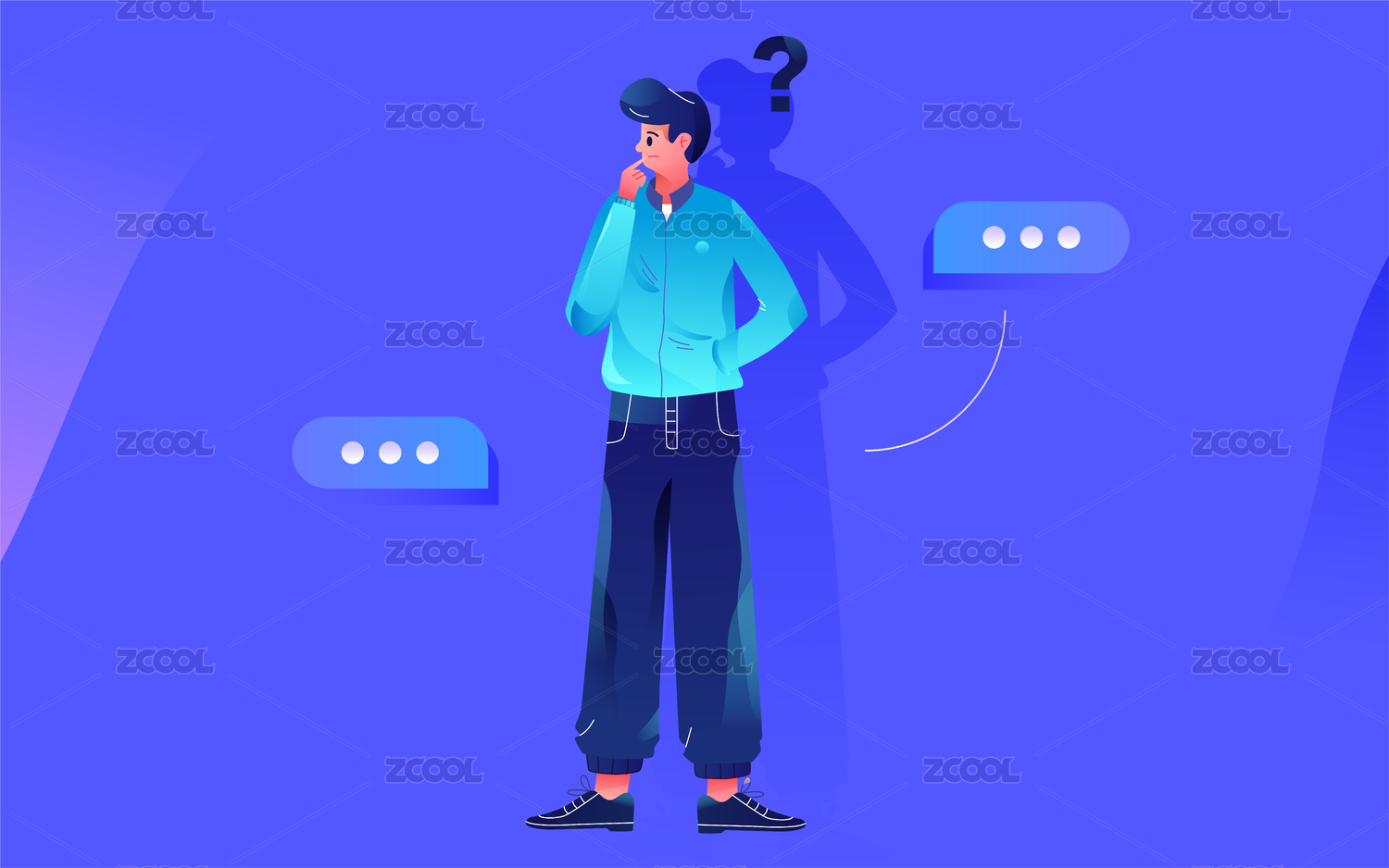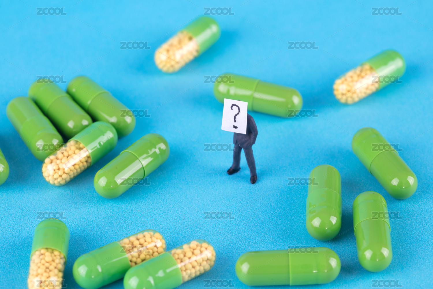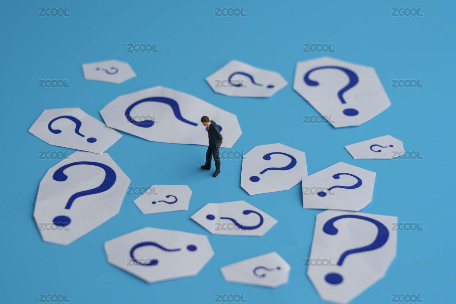 藍(lán)色背景中一堆問(wèn)號(hào)中站著焦慮的男士微縮創(chuàng)