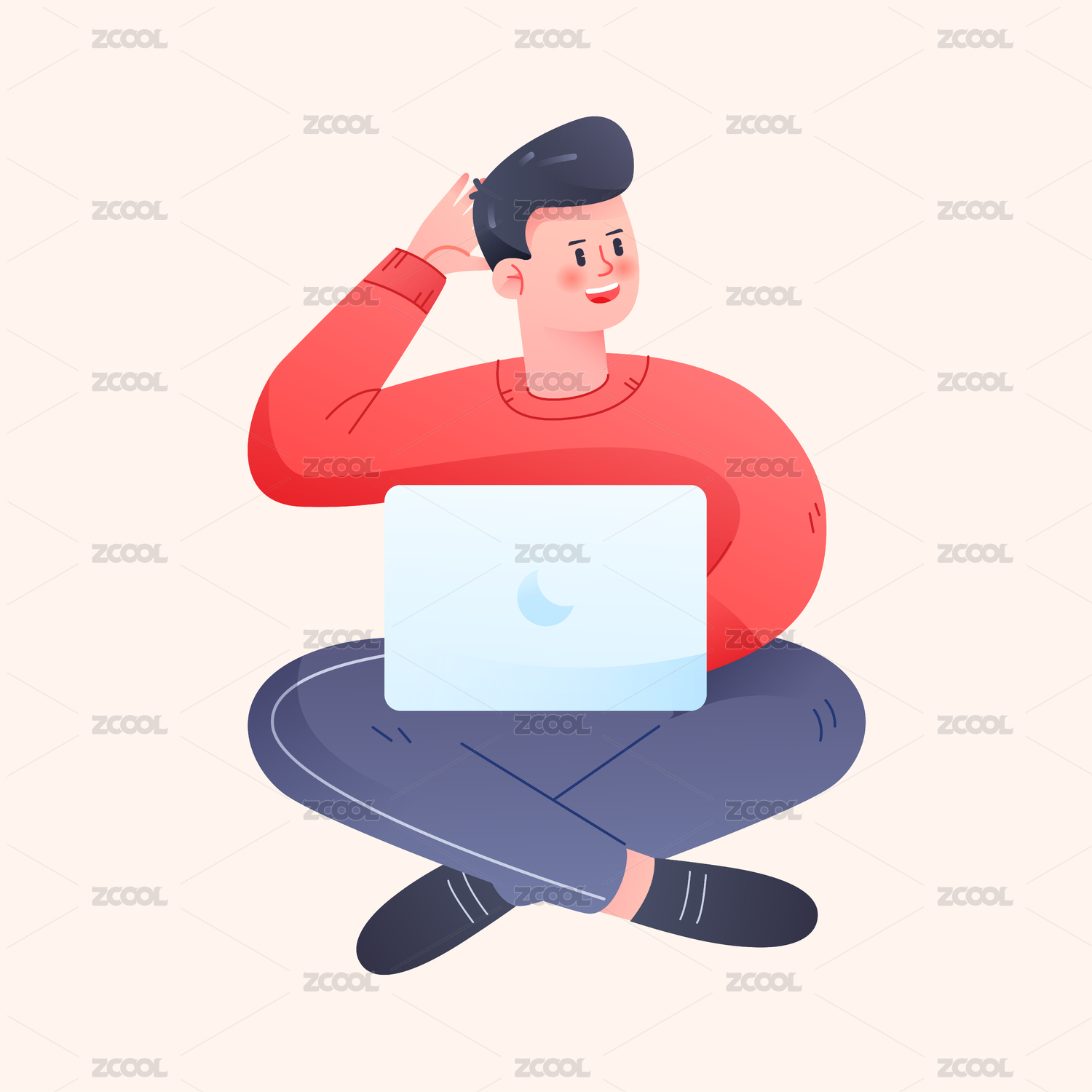卡通男生玩電腦青少年人物摸頭疑問(wèn)矢量插畫