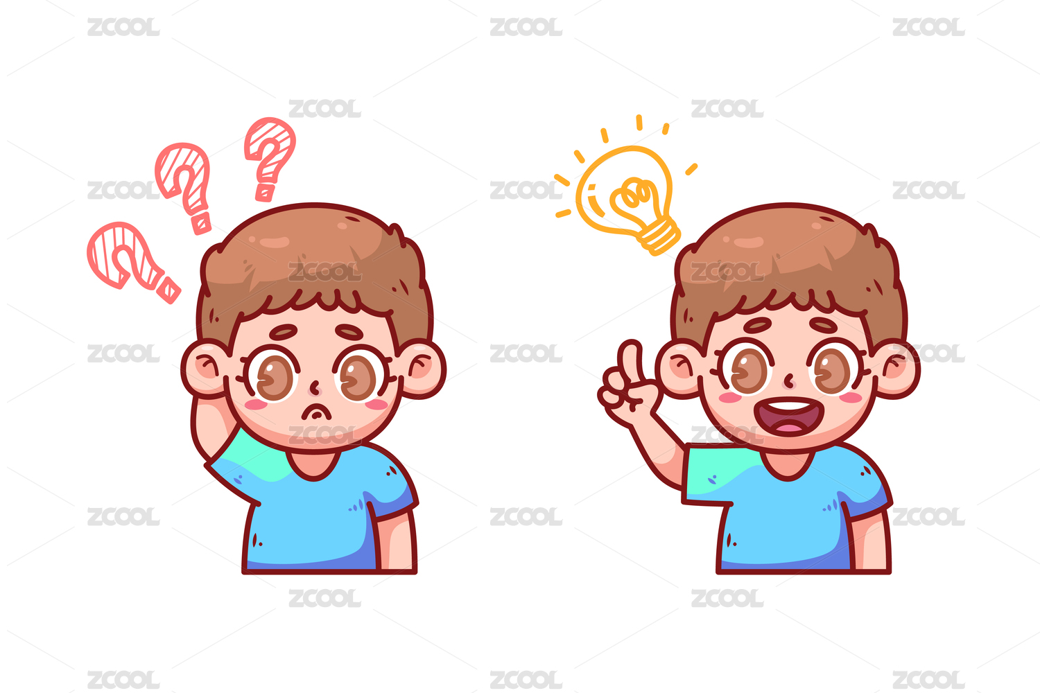 男孩子頭上頂著問(wèn)號(hào)和燈泡矢量插畫