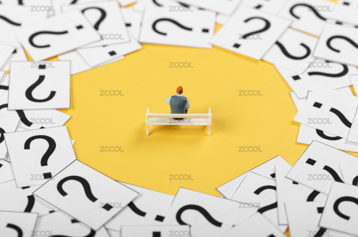 微縮創(chuàng)意問(wèn)號(hào)堆里坐在長(zhǎng)椅上思考的男性