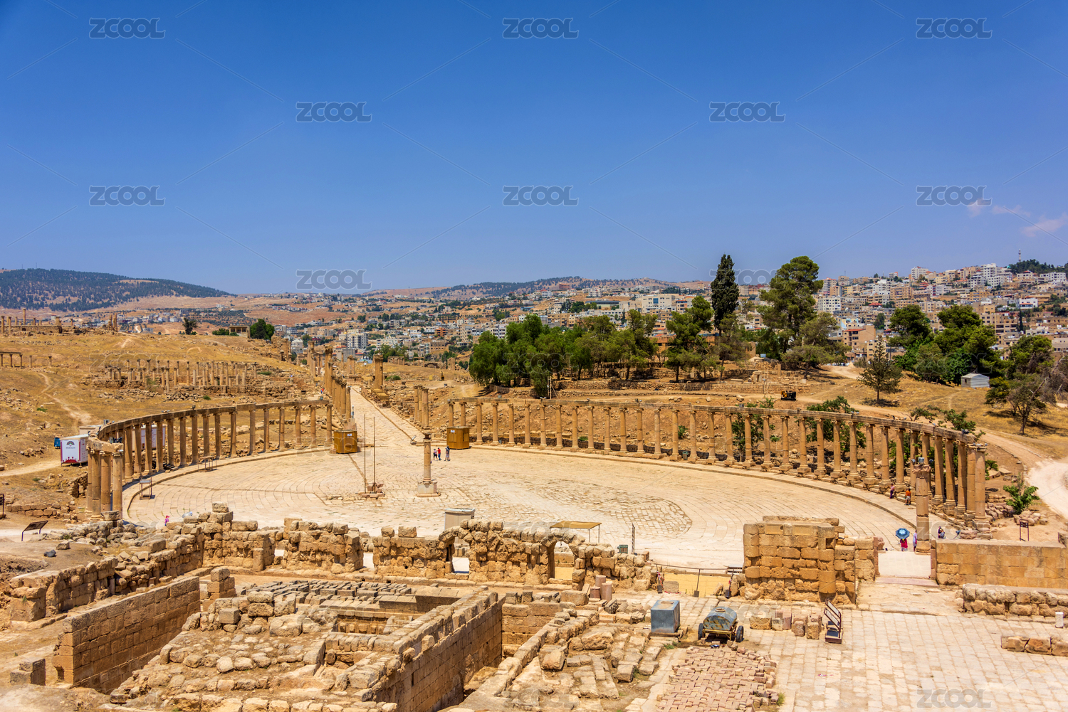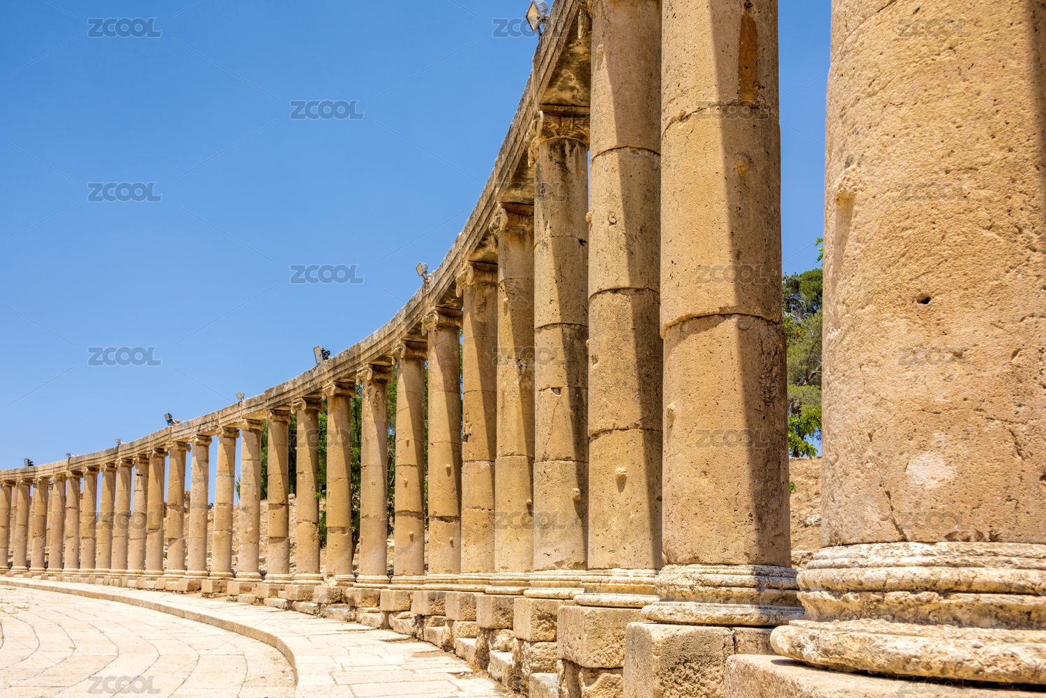 亞洲約旦杰拉什古城遺址橢圓廣場(chǎng)上的石柱