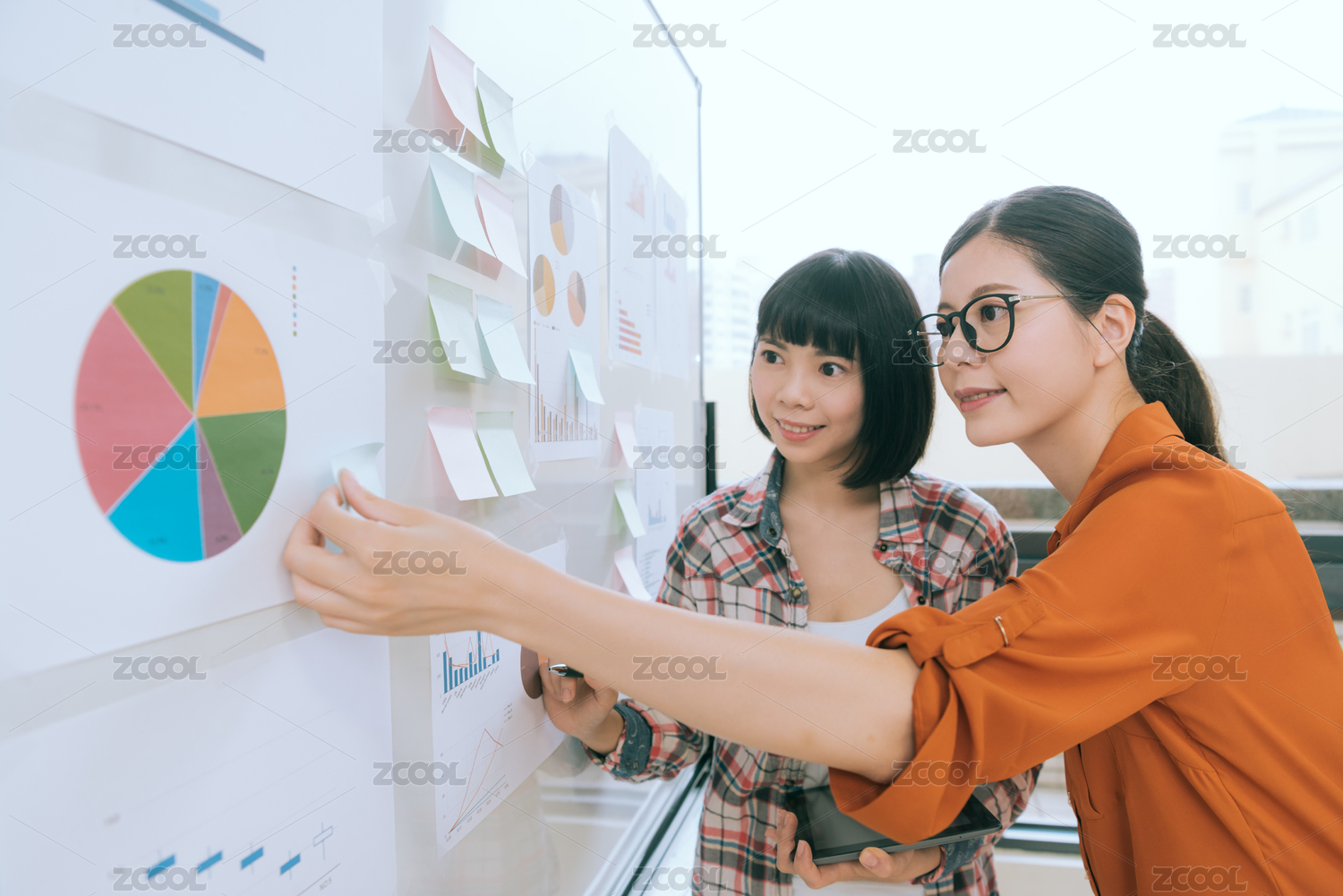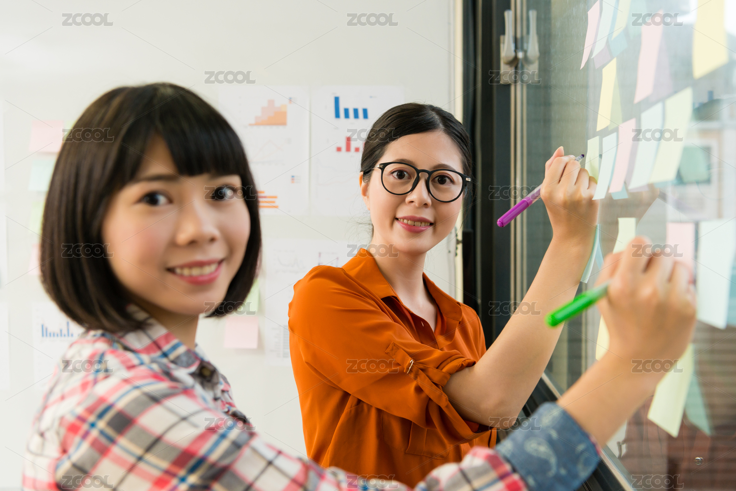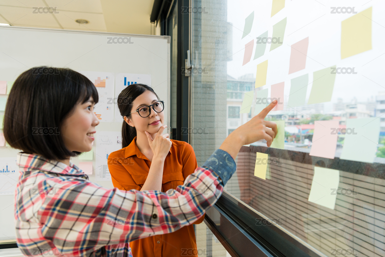 專業(yè)公司女職工隊伍會議玻璃墻,許多便條紙后,面向相機選擇的重點照片。