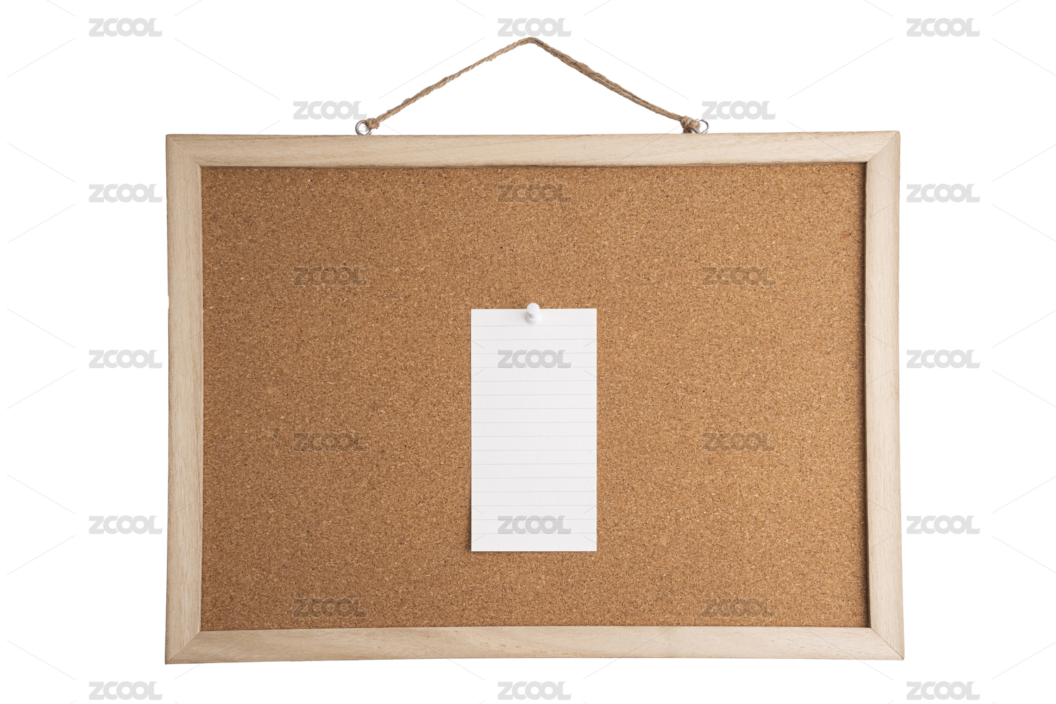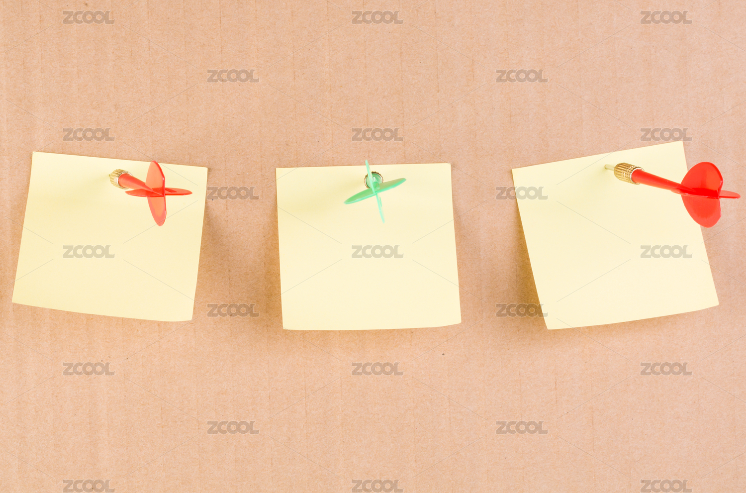 軟木板上的帶著圖釘?shù)谋銞l紙
