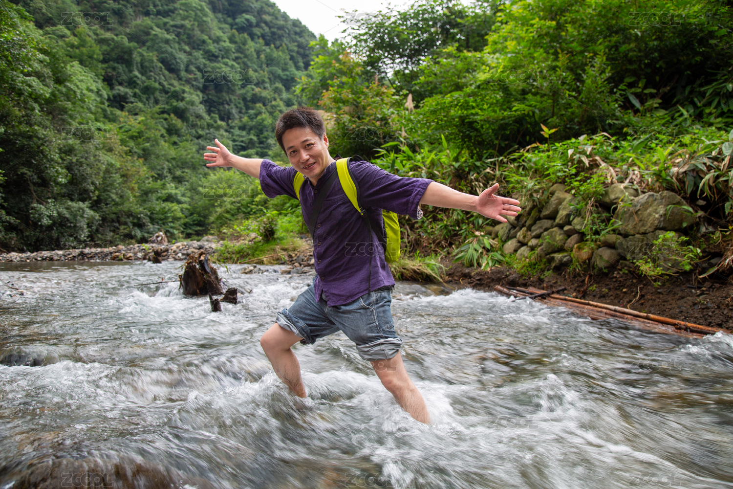 男子赤腳涉水溯溪,溪水中快樂行走享受自然