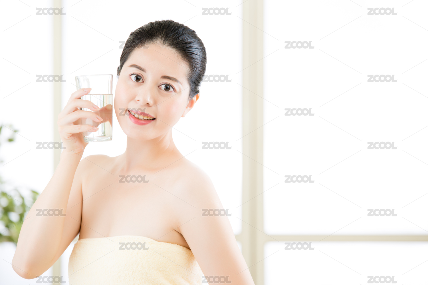 美麗的亞洲女性淋浴,毛巾纏身體,室內(nèi)背景后享受自然干凈的水