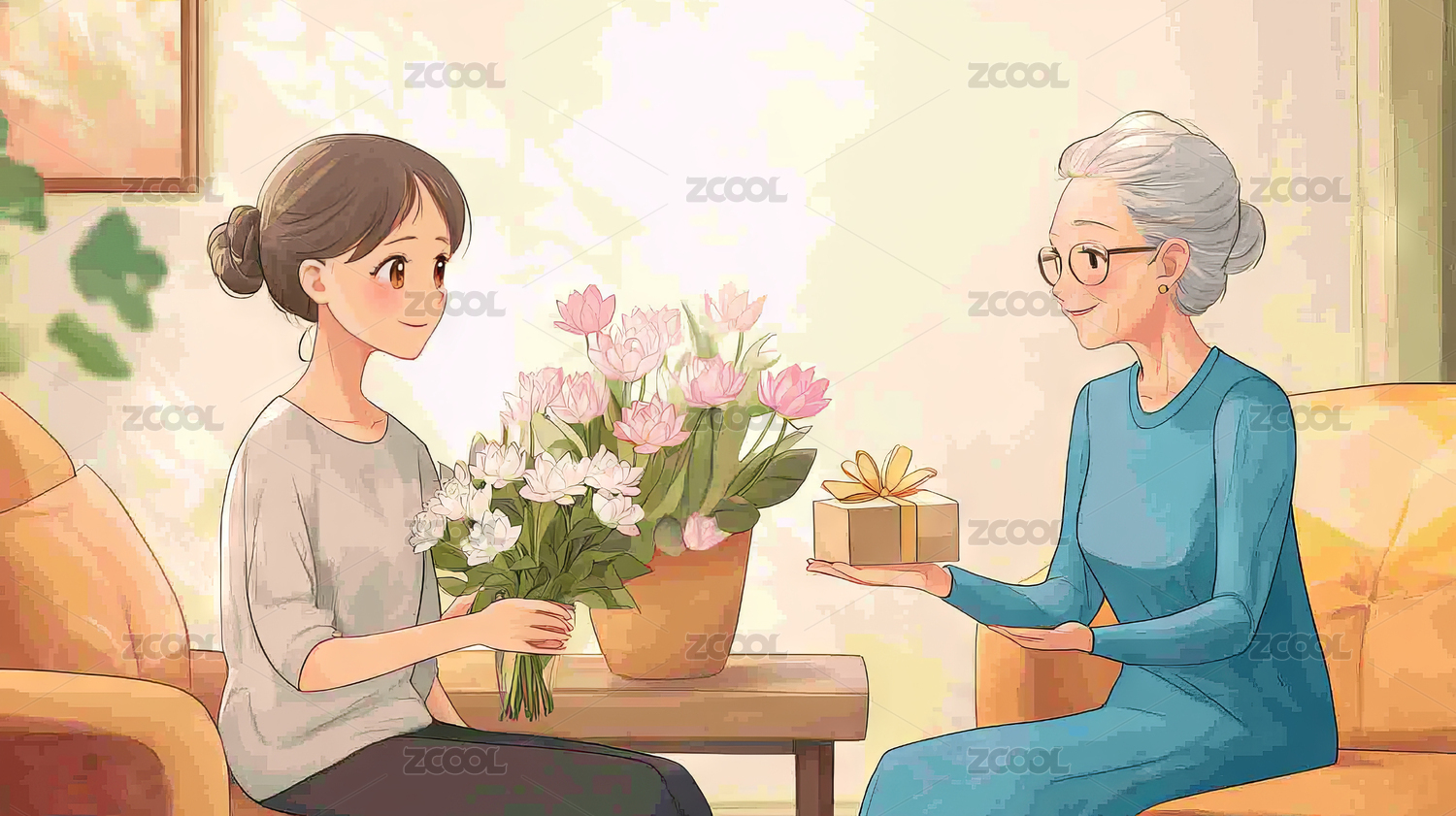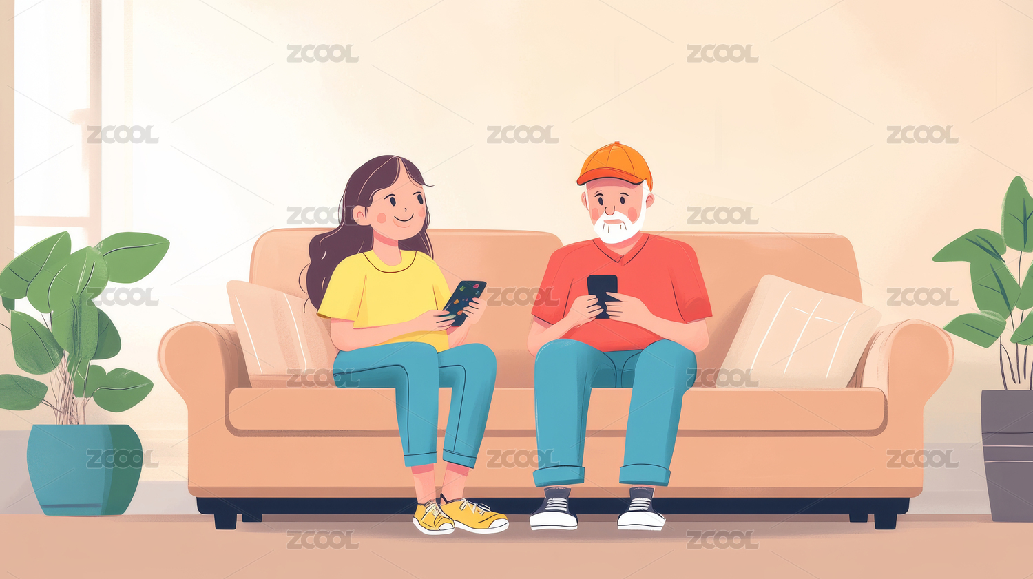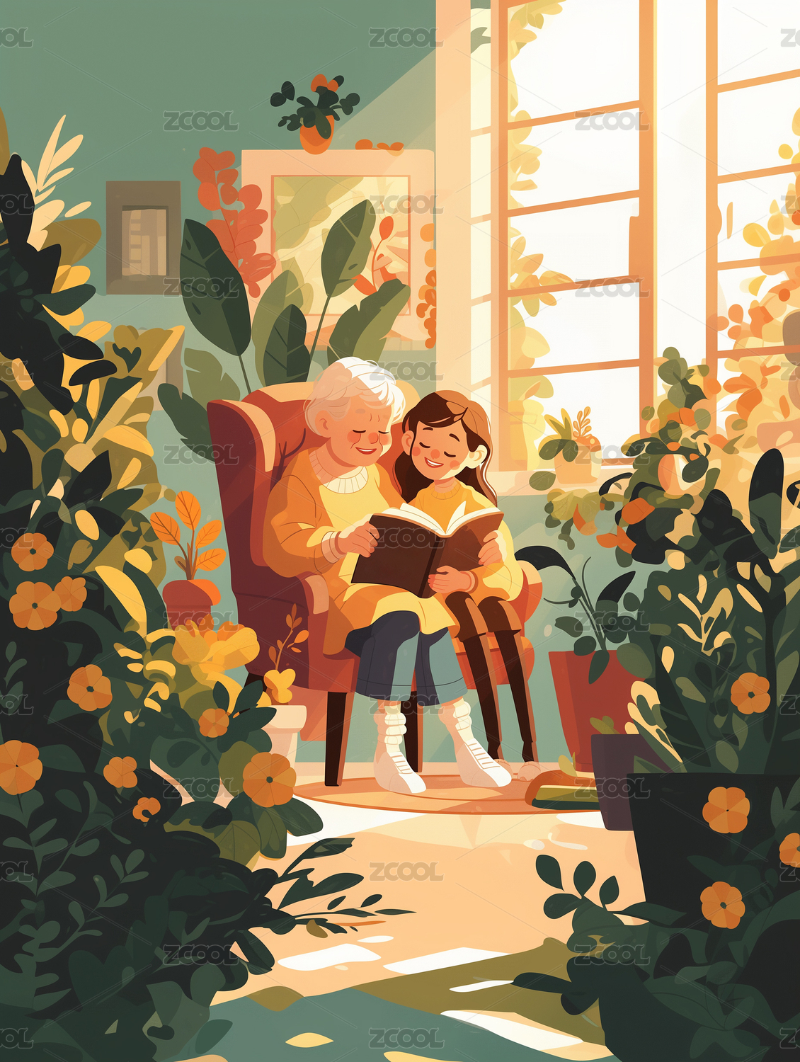年輕人陪伴老人在窗旁邊的沙發(fā)上看書