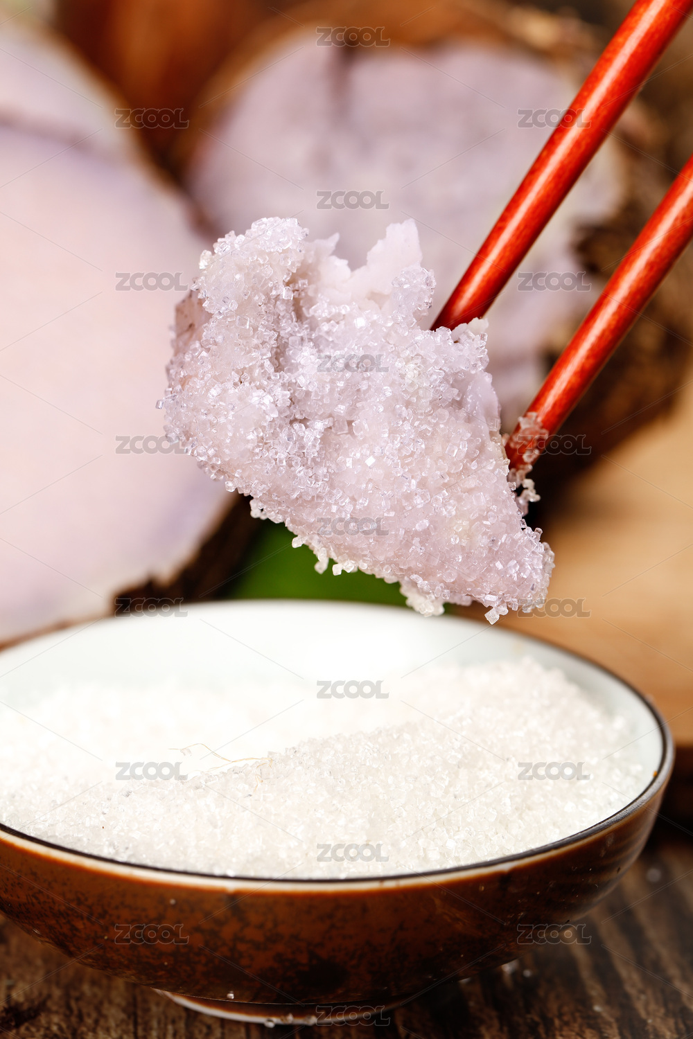 木底上放著一碟白糖和筷子上夾著蘸過糖香芋