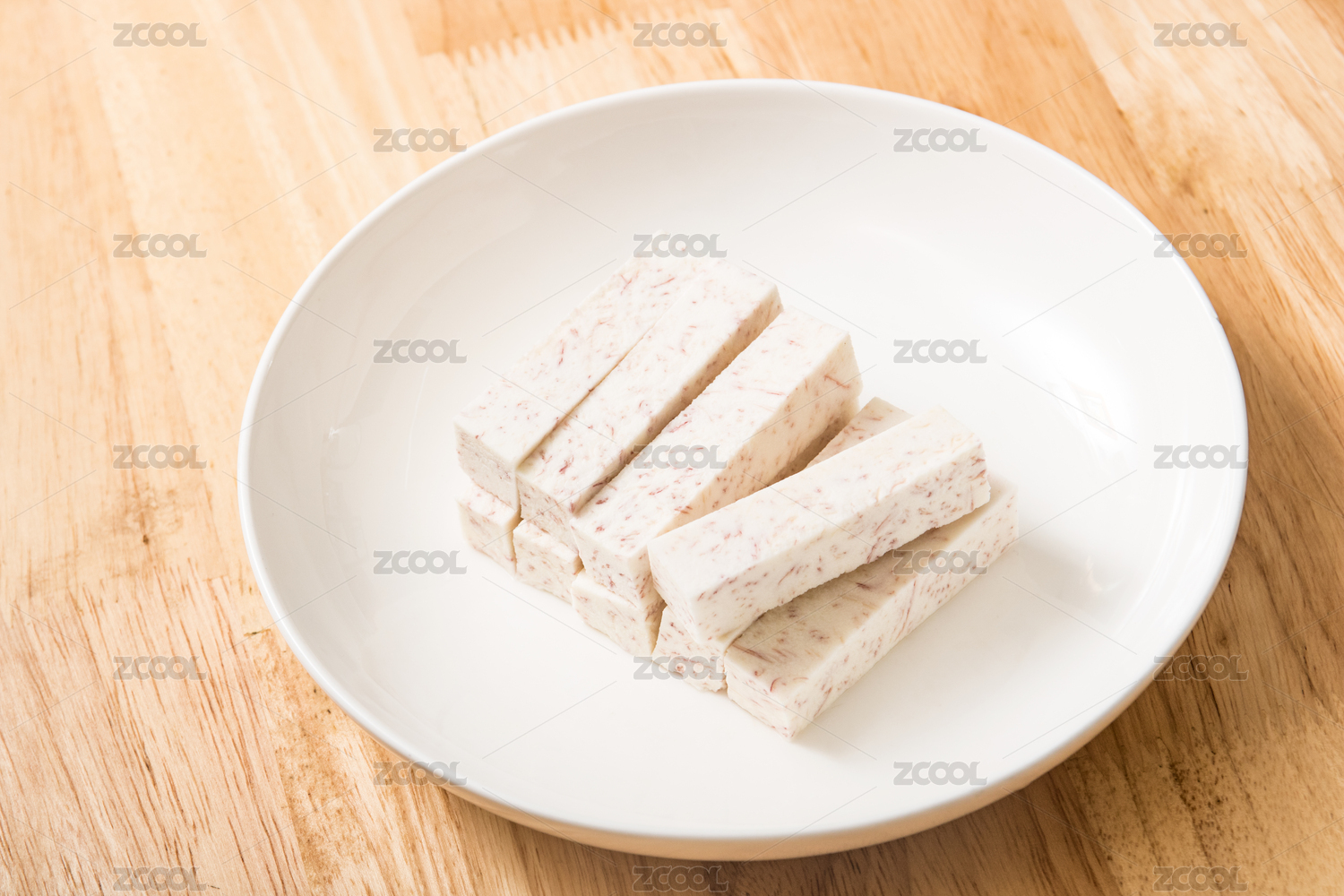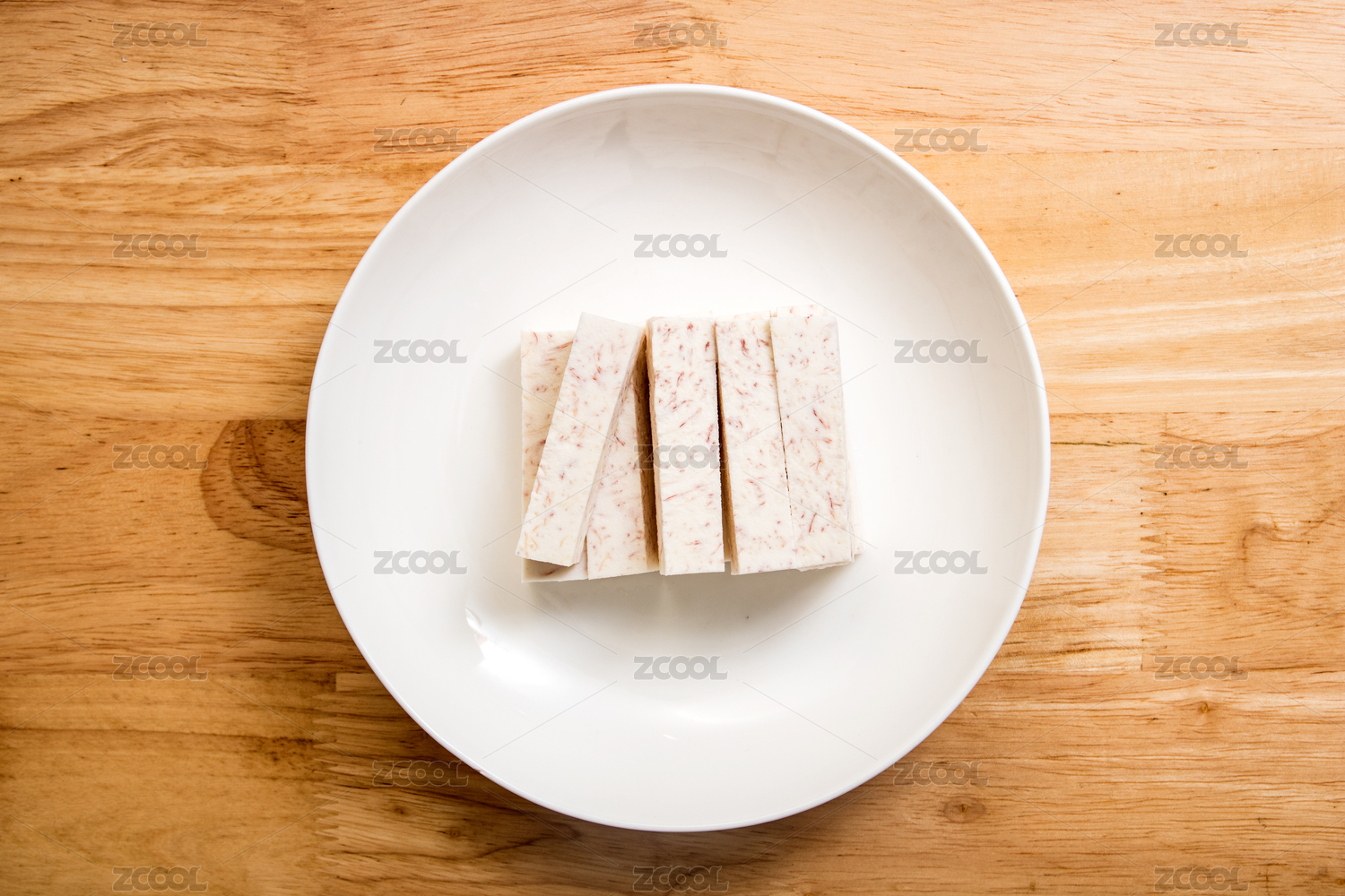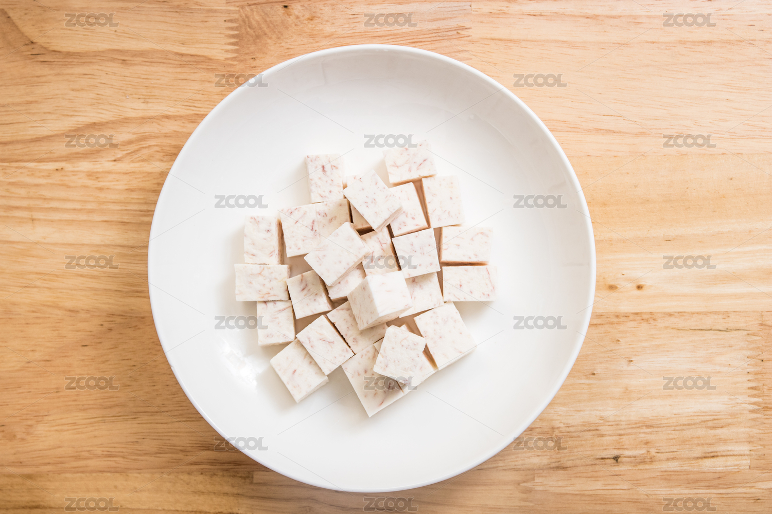 木紋桌面上一碟裁切整齊的香芋塊食材