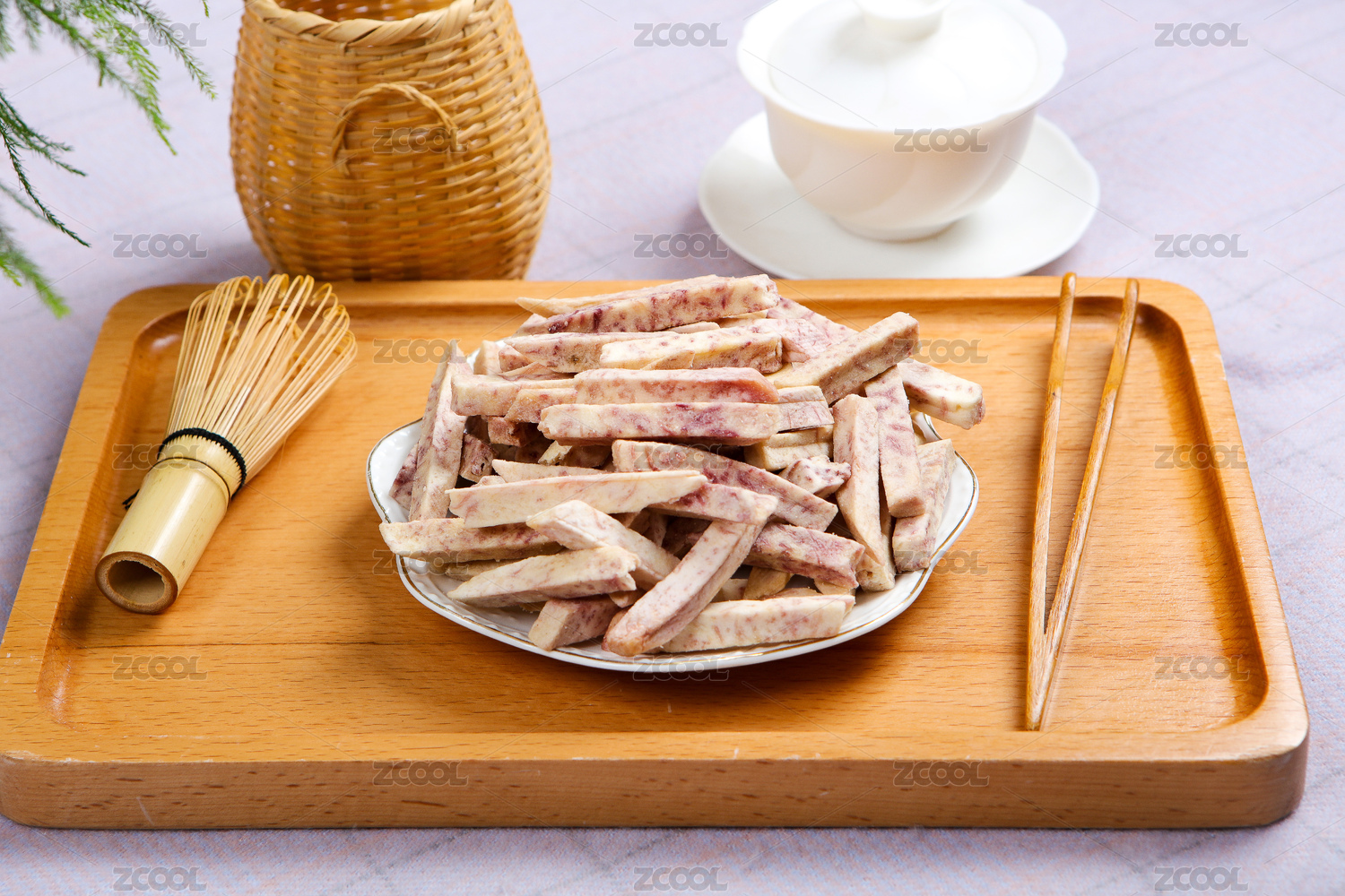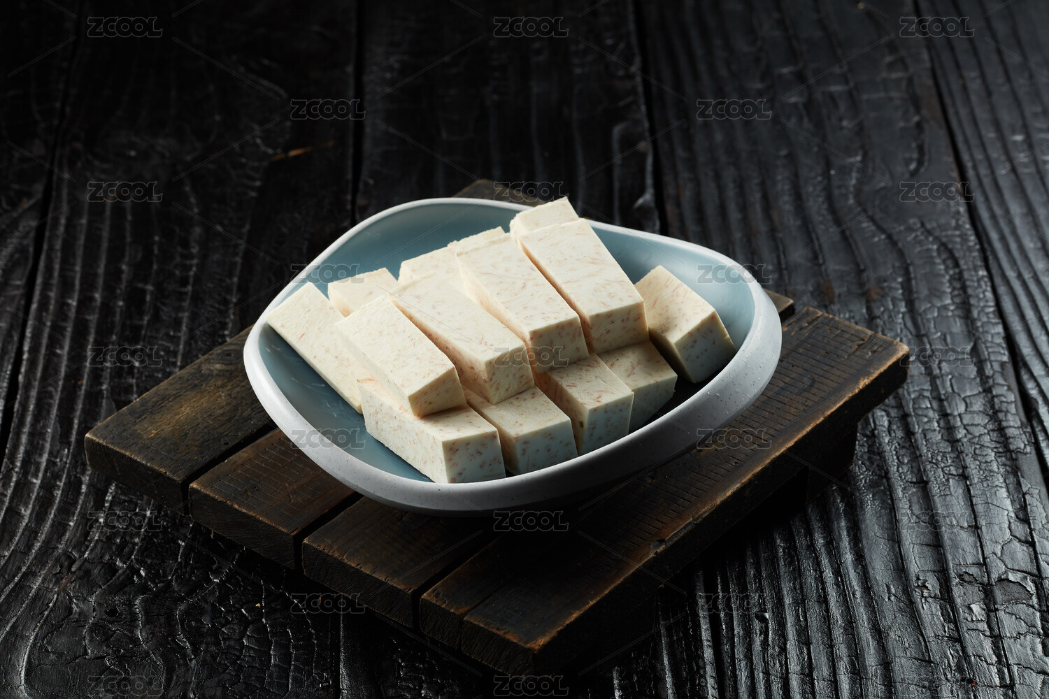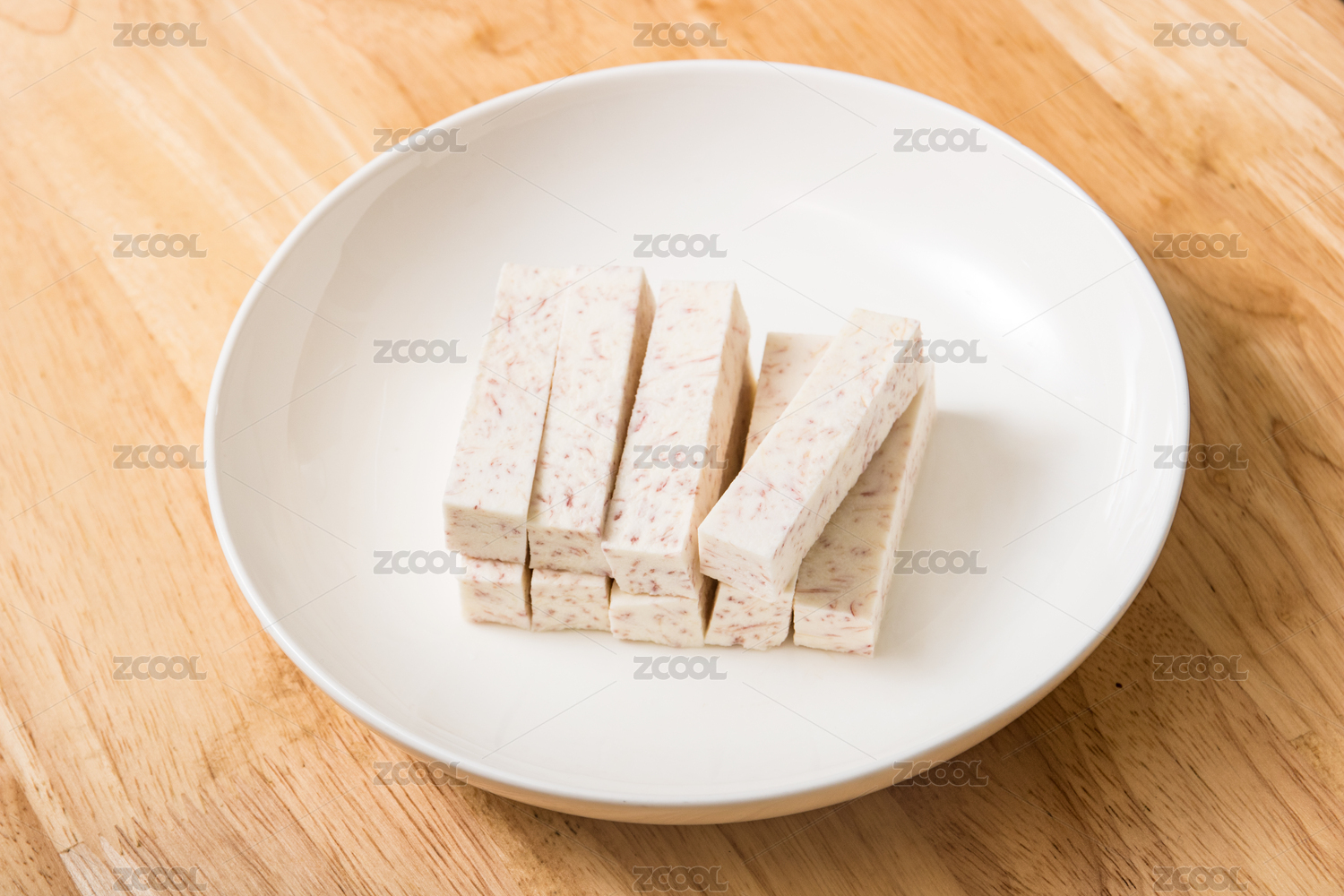 木紋桌面上一碟裁切整齊的香芋塊食材