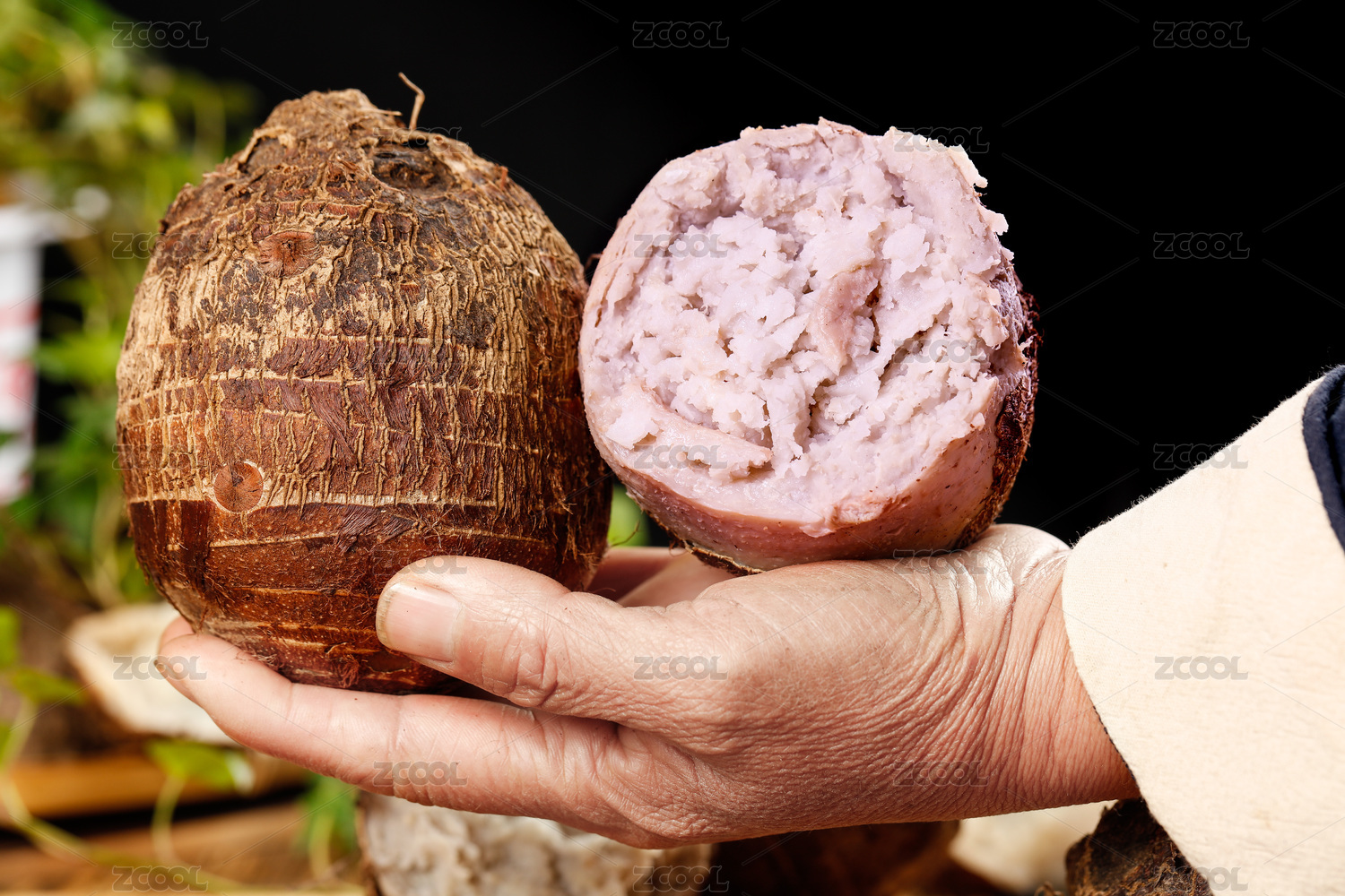 木板上放著一堆芋頭和手上拿著半邊香芋