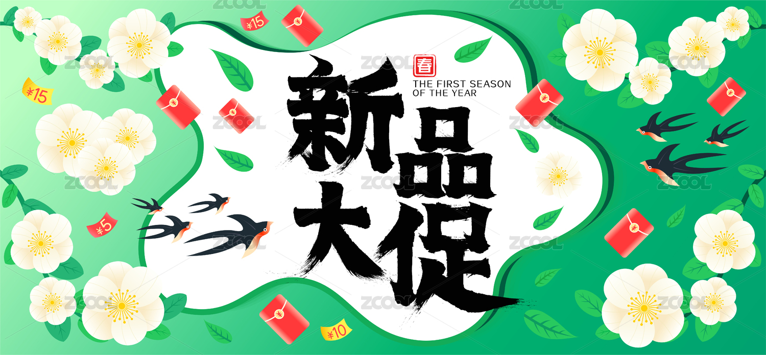 綠色發(fā)光漸變新品上市梨花燕子紅包狂歡書法