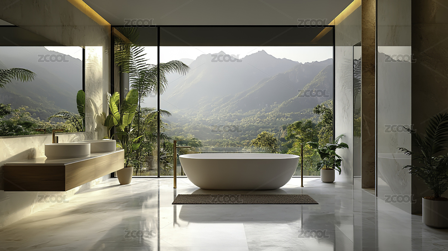 現(xiàn)代化的浴室有大窗戶可俯瞰群山。