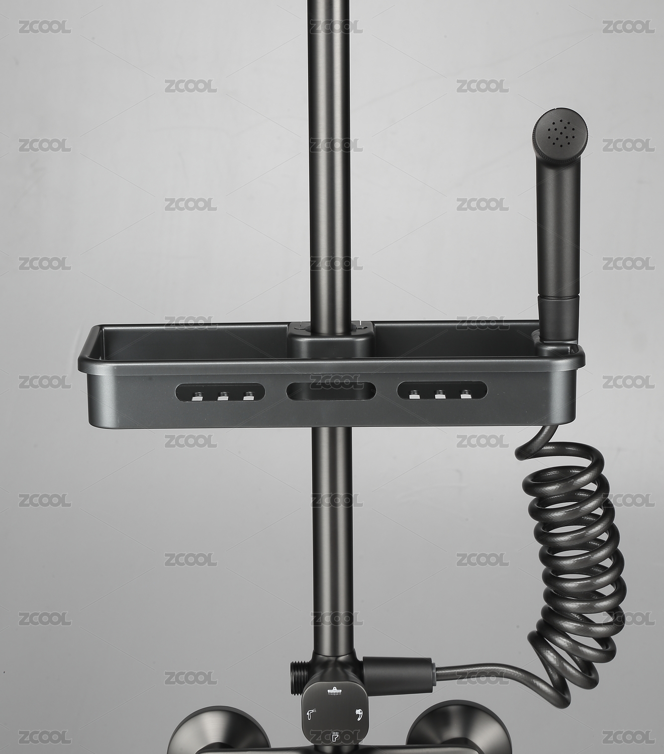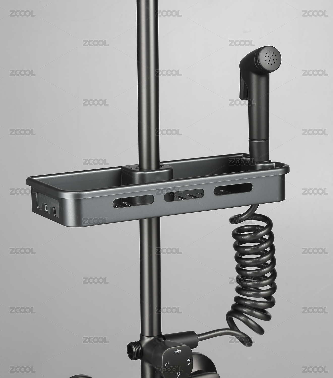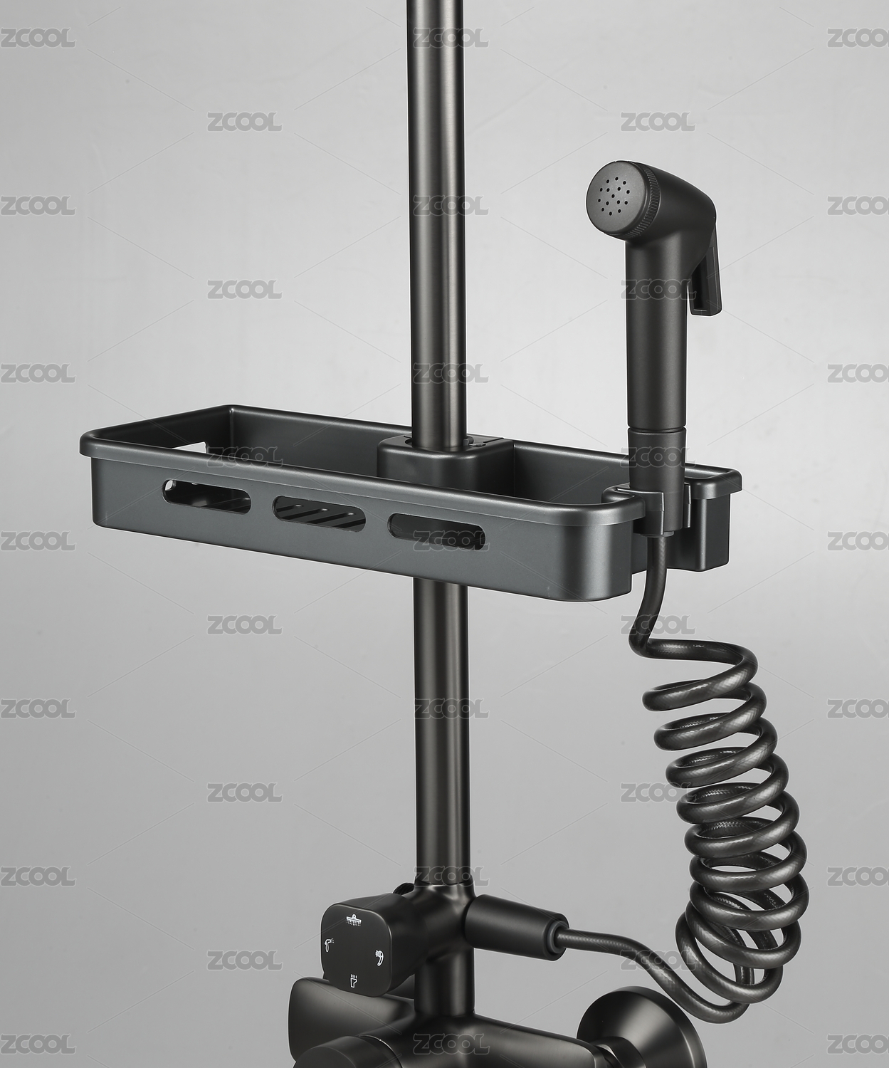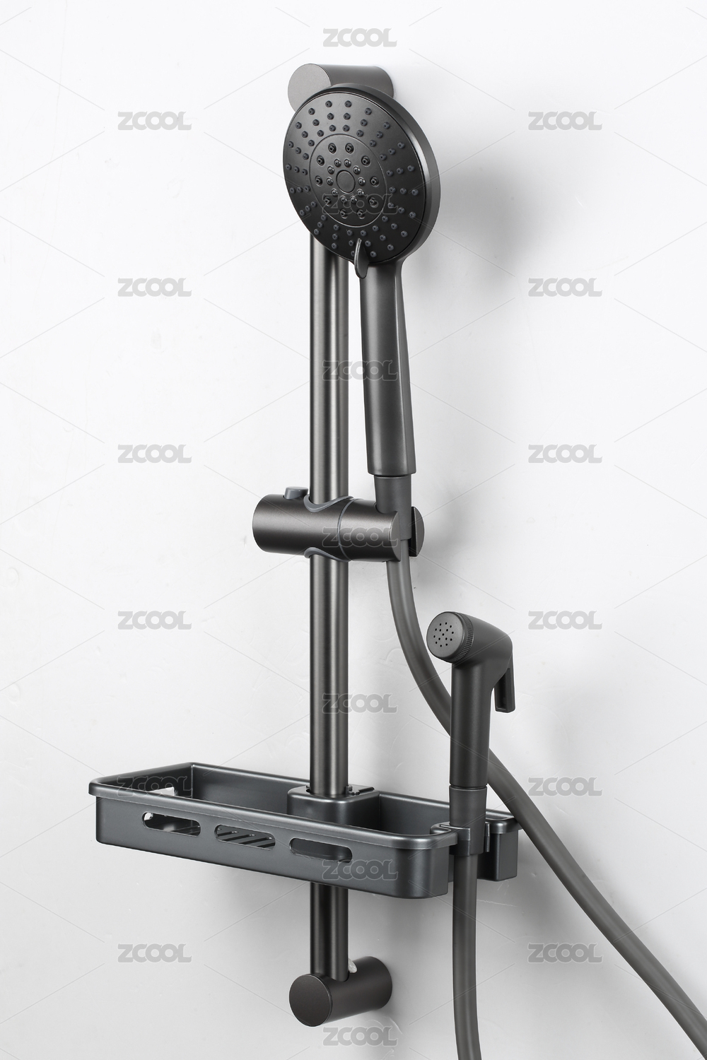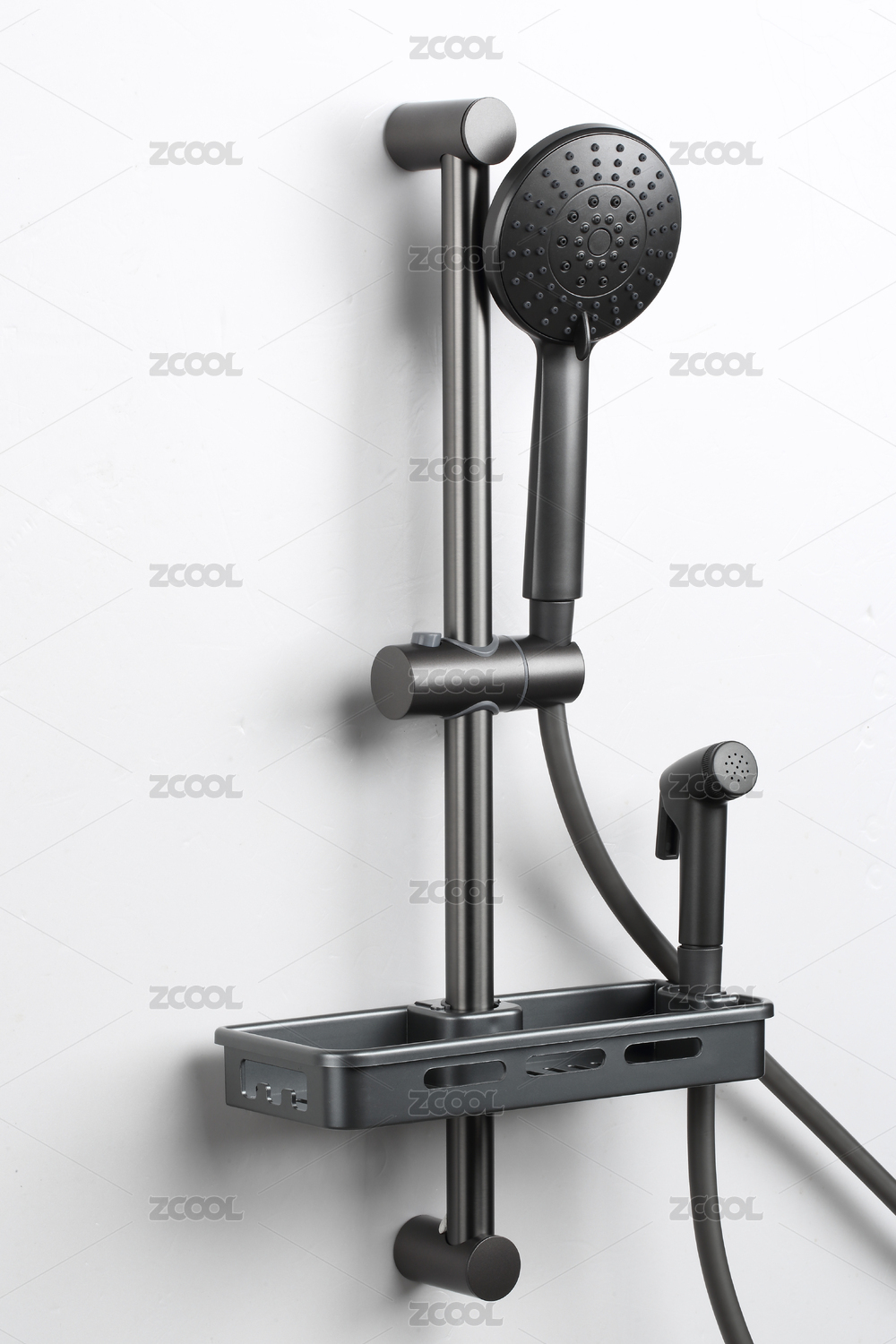 黑色淋浴花灑上的置物架白底特寫