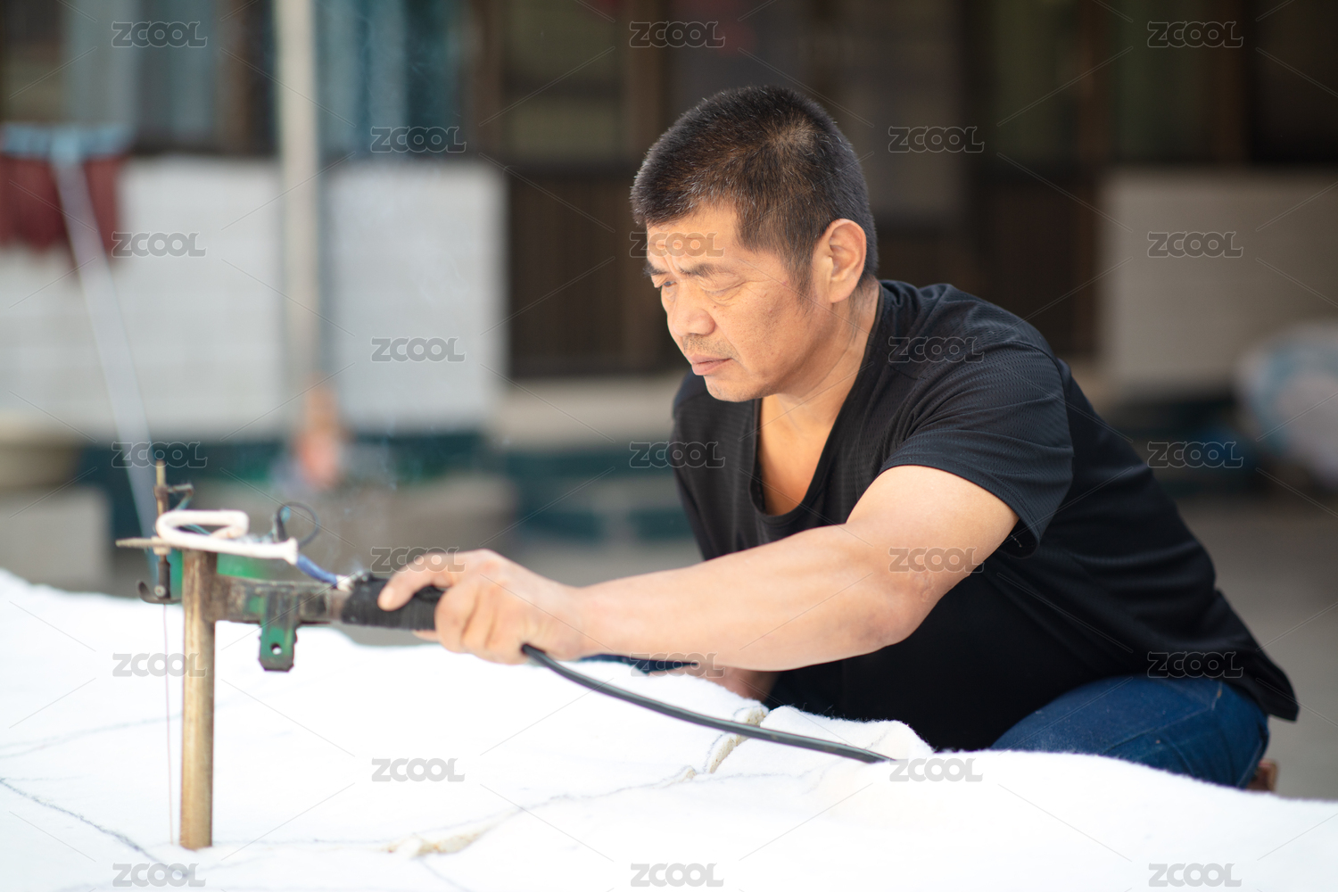 制衣工人在切割棉襖填充的聚酯纖維
