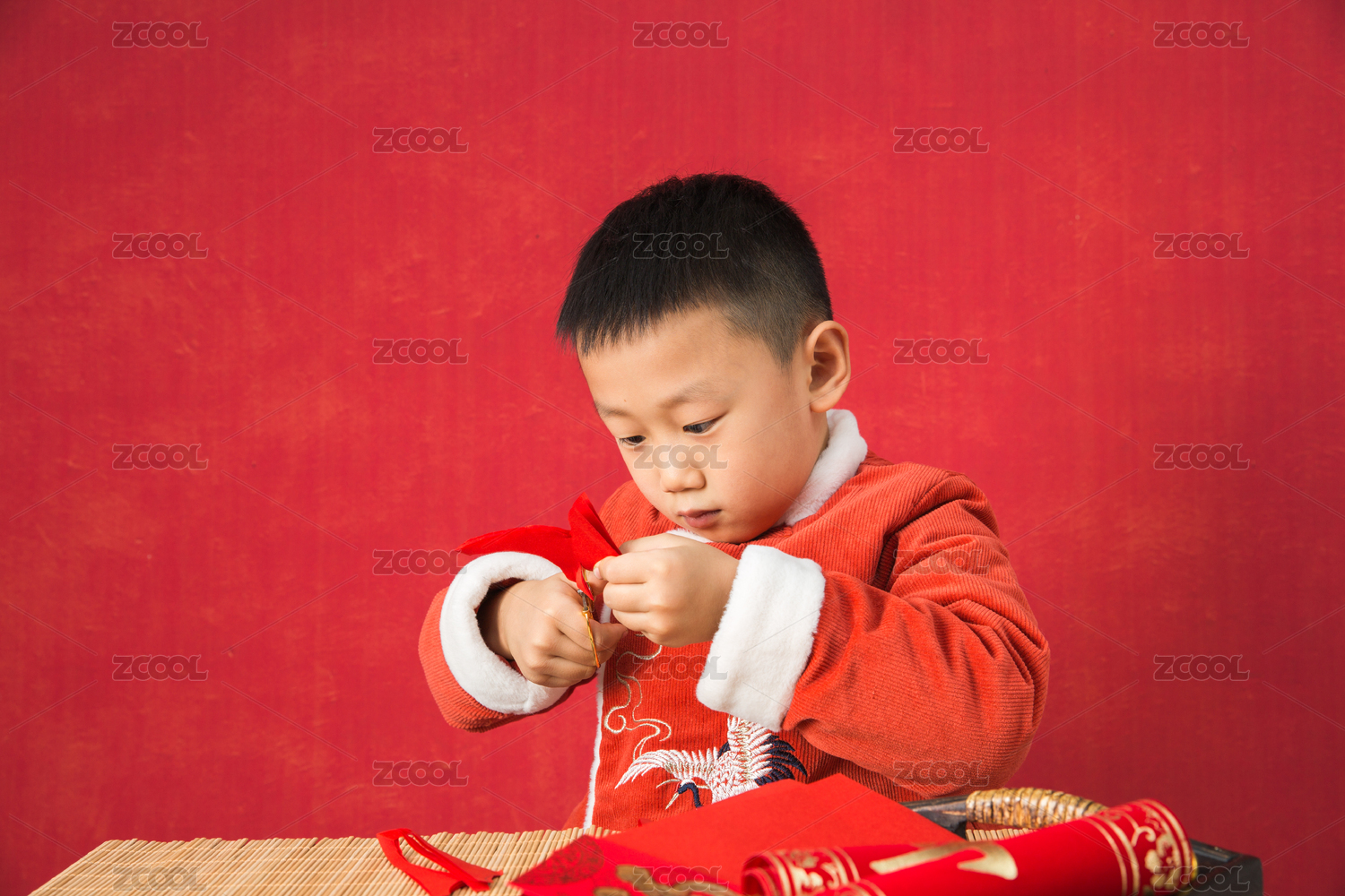 亞洲中國男孩穿紅棉襖在室內(nèi)過春節(jié)