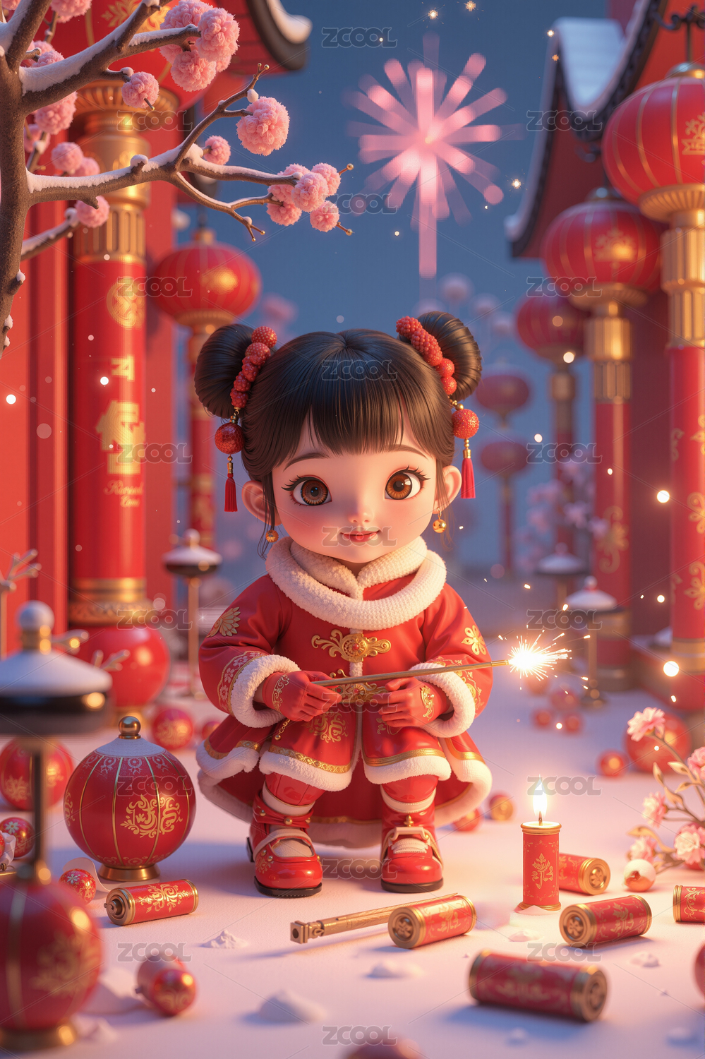 紅燈籠下的穿傳統(tǒng)小棉襖少女新年插畫