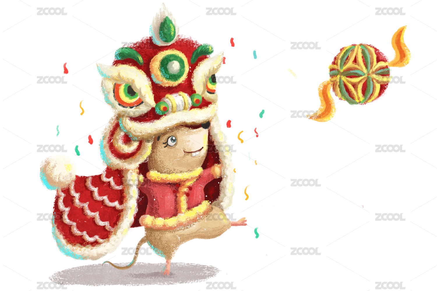 穿著紅色棉襖的小老鼠舞獅子耍繡球