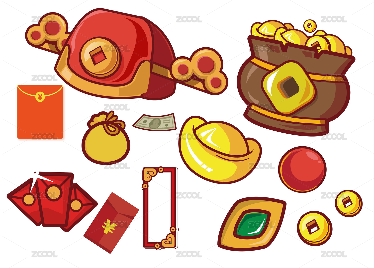 招財元寶金幣福袋財神爺紅包矢量素材合集