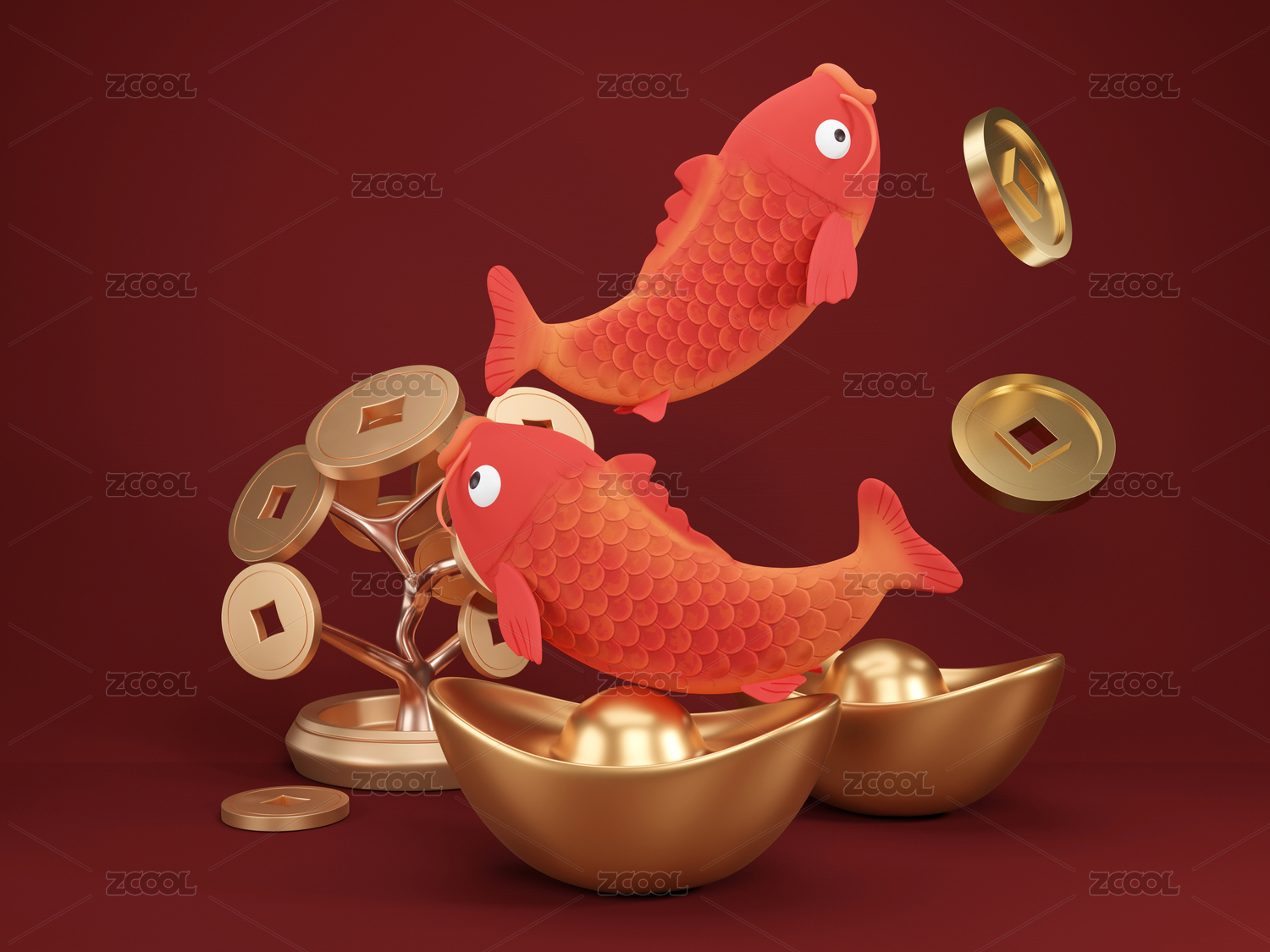 春節(jié)元寶堆上的3D紅色錦鯉魚