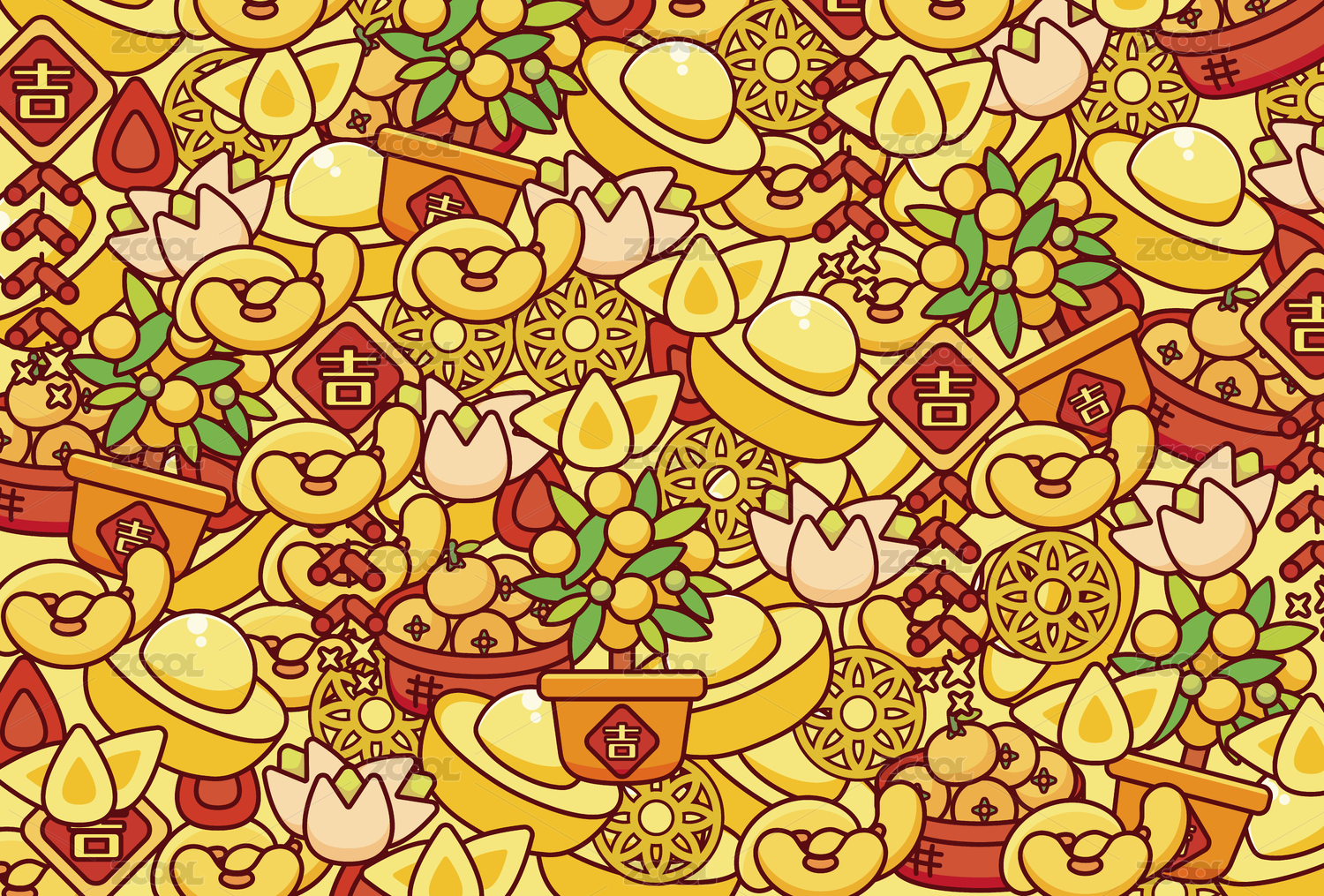 吉祥元寶大吉盆栽鞭炮平鋪插畫