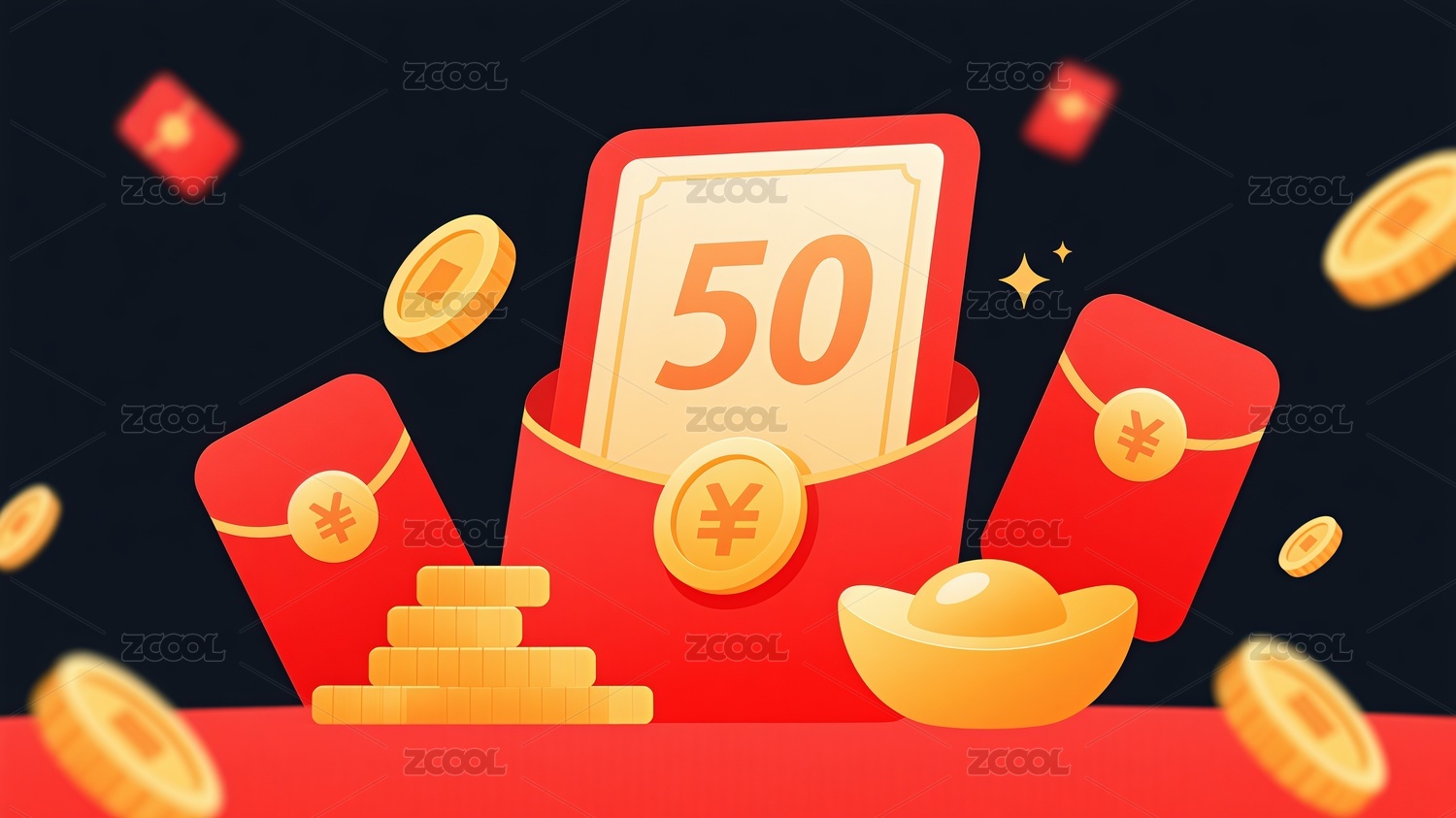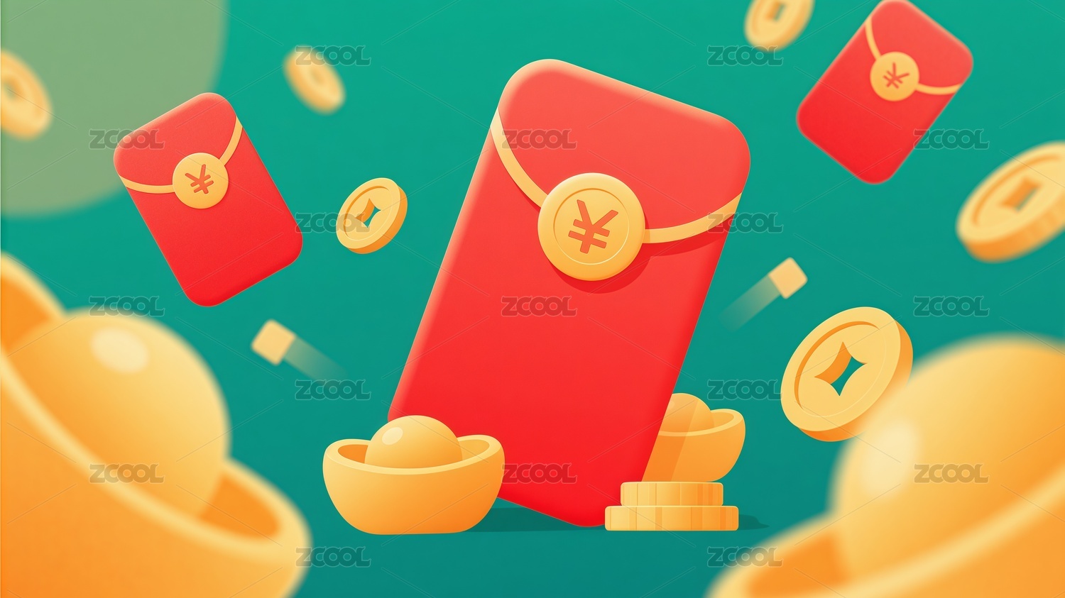 扁平風格喜慶紅包金元寶金幣插畫