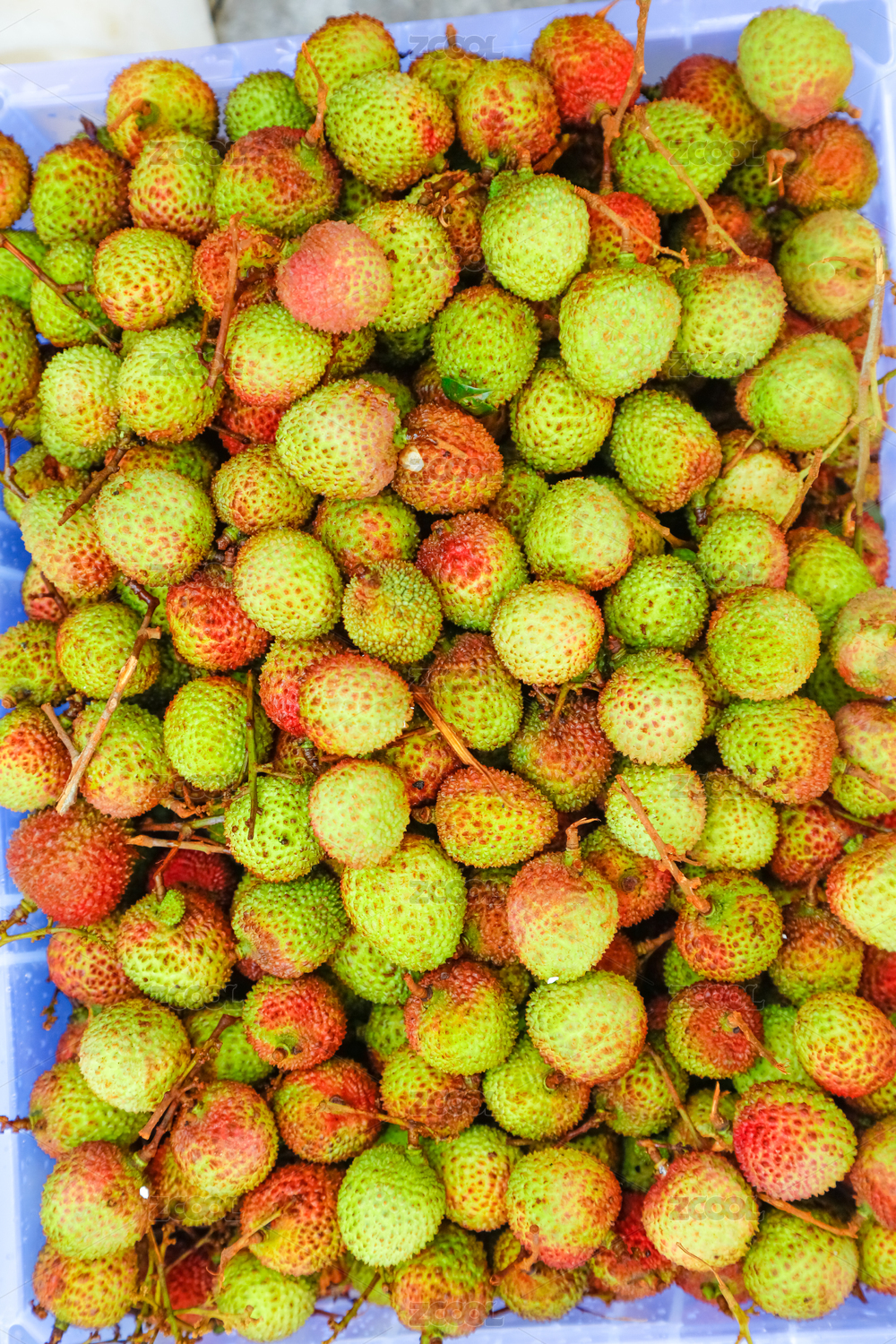 深底上放著一堆新鮮妃子笑荔枝