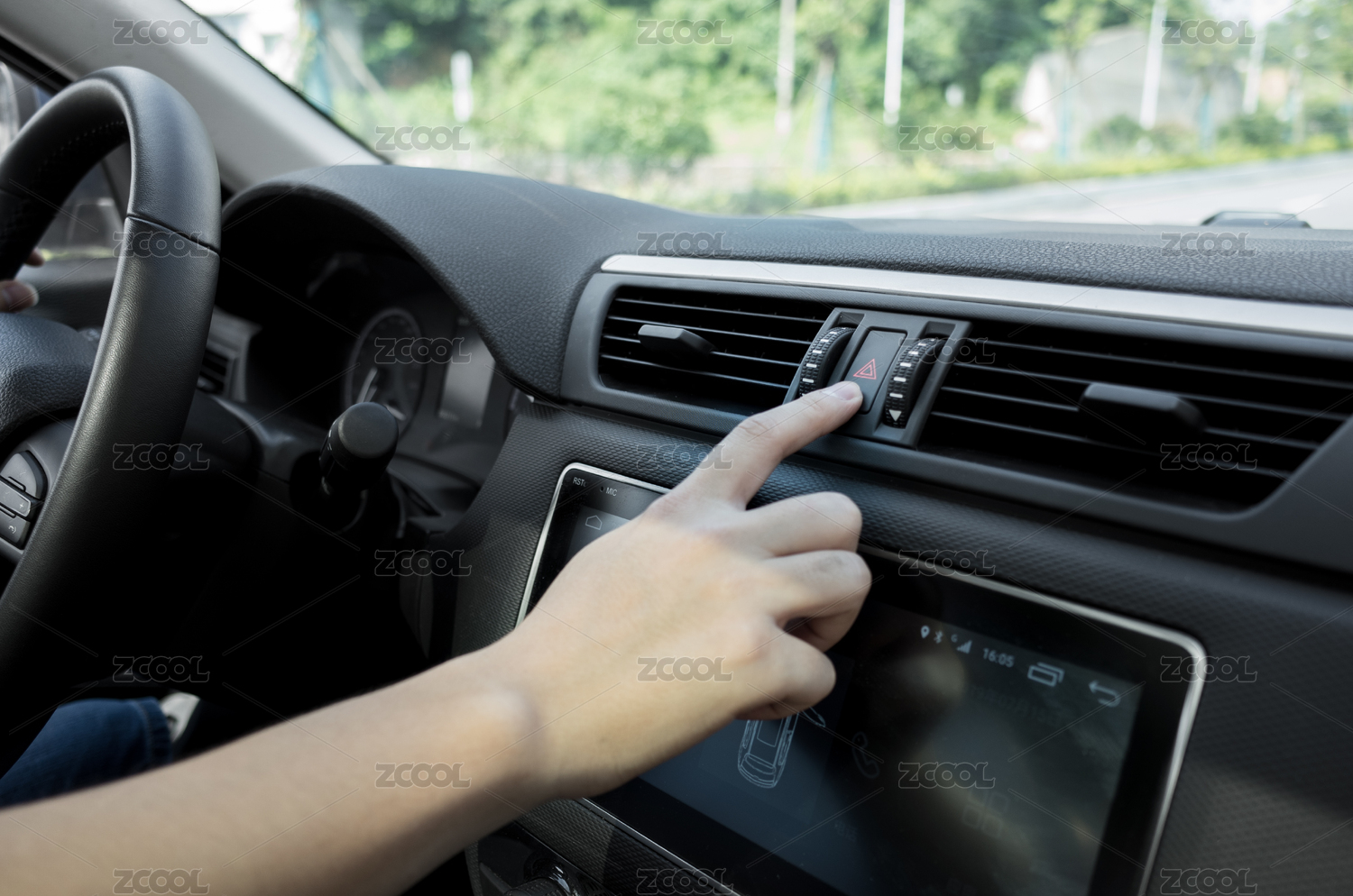 坐在駕駛室的一個男性青年正在打開汽車的危險指示燈
