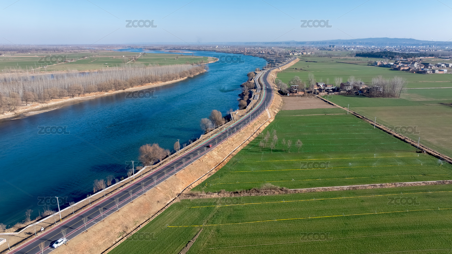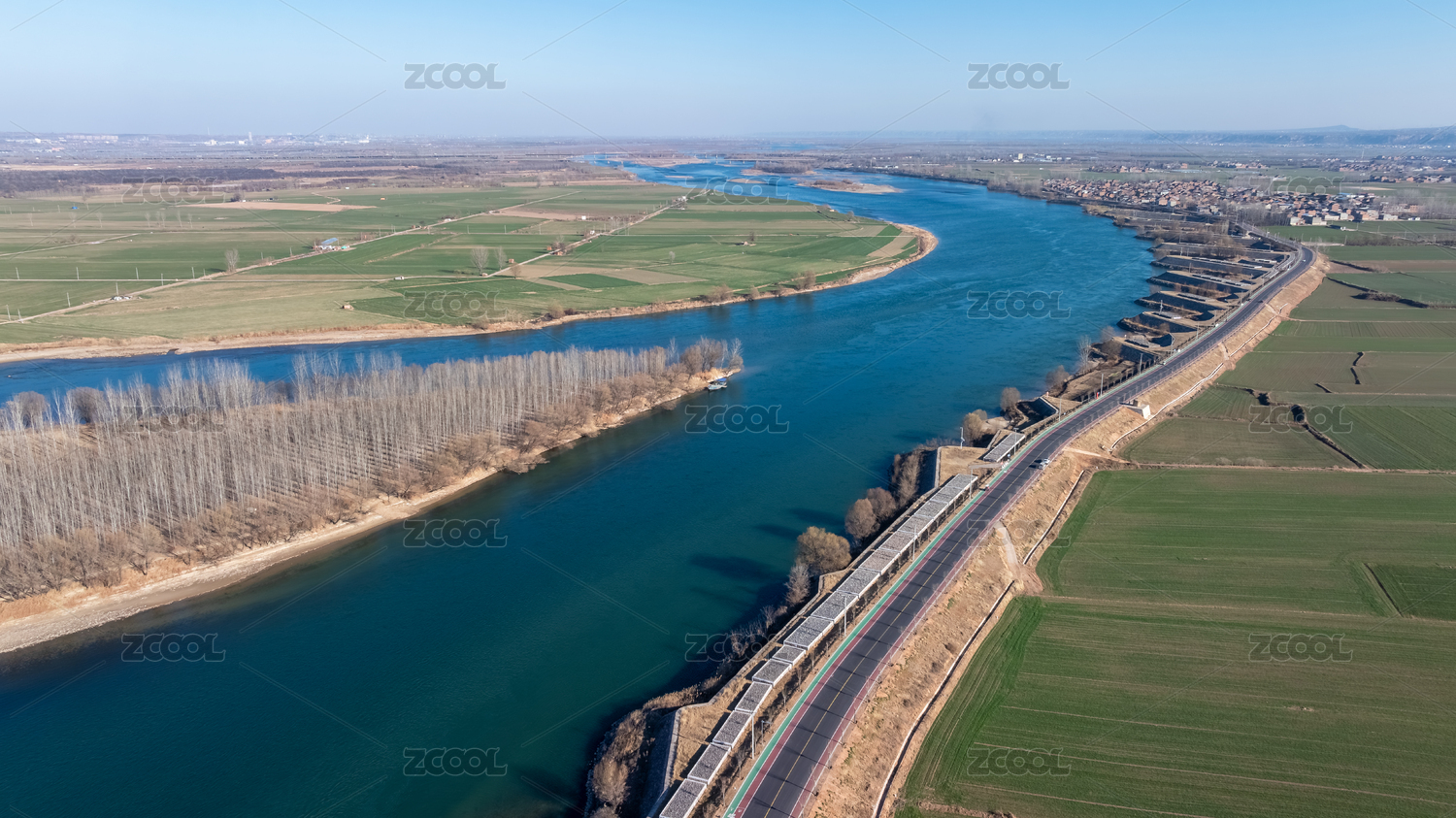 航拍黃河濕地防洪堤壩旅游道路