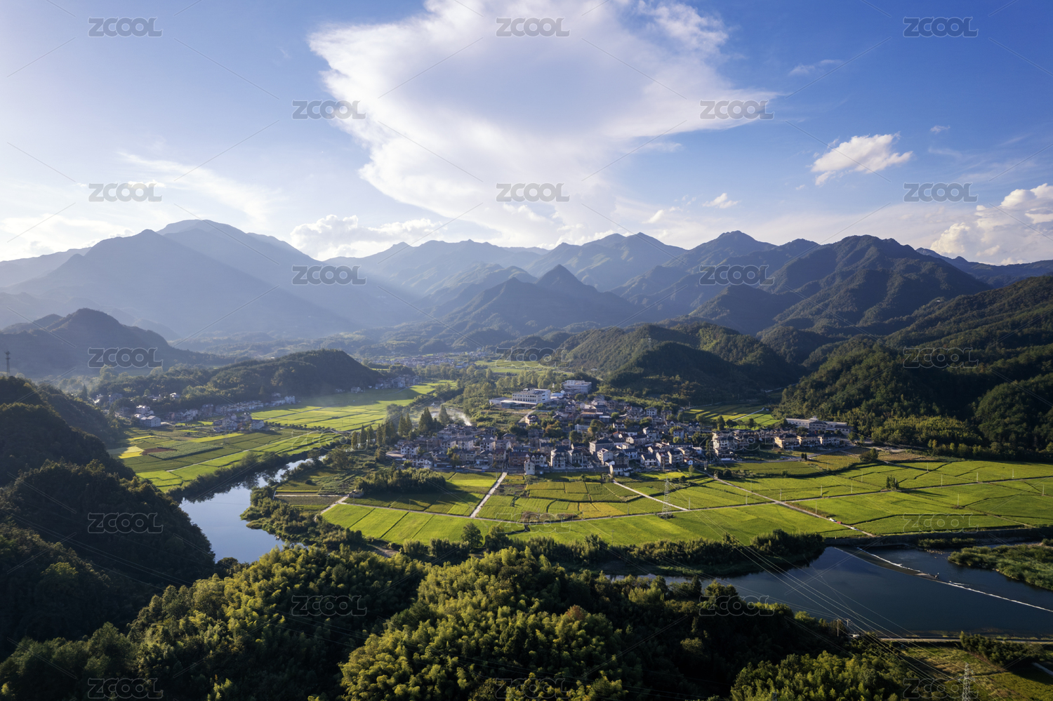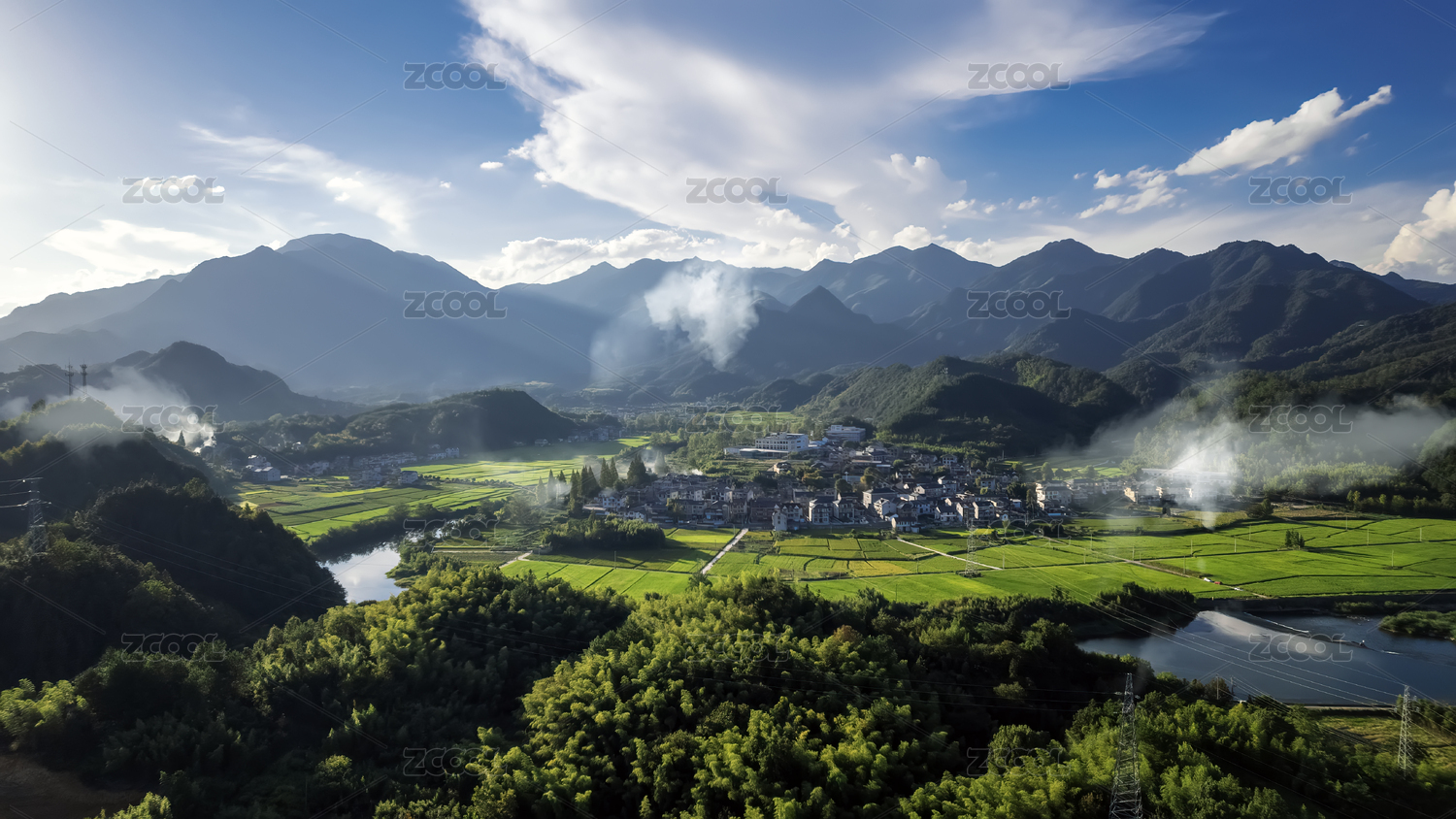 航拍徽州新安江青山綠水鄉(xiāng)村田園