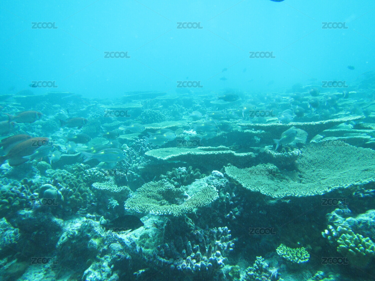 海洋珊瑚礁中穿梭覓食的魚群特寫