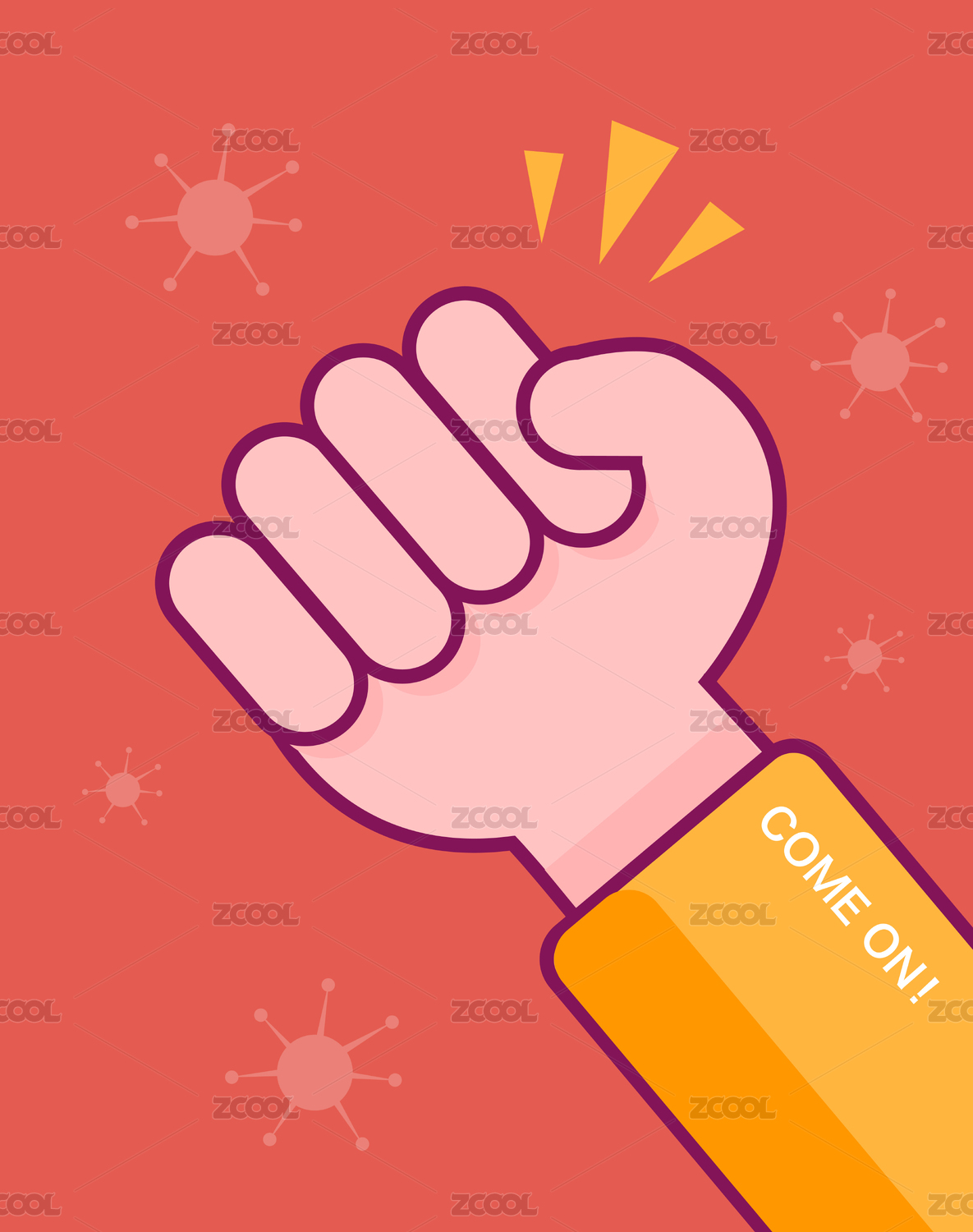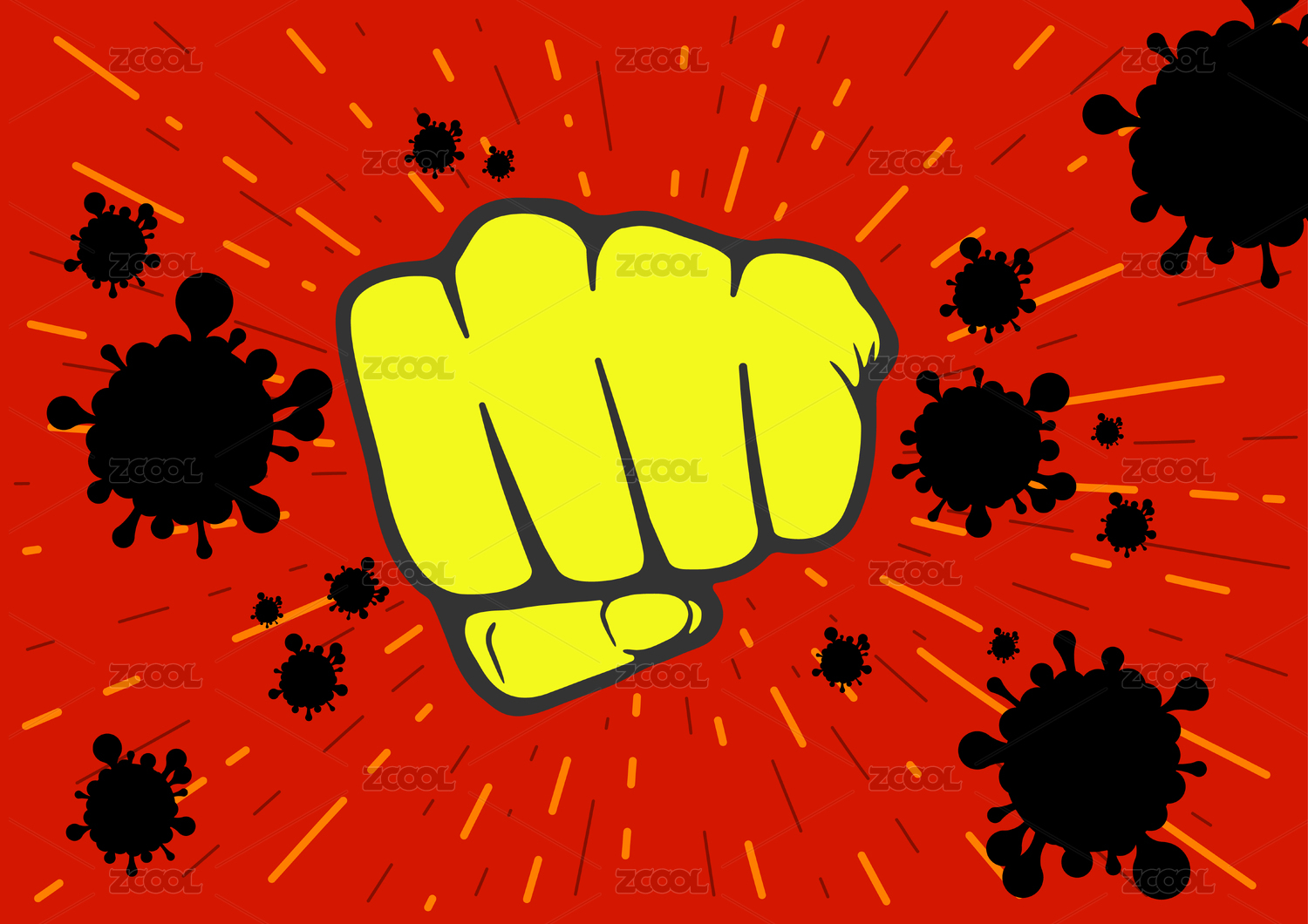 紅色背景前的矢量拳頭和黑色的新冠病毒