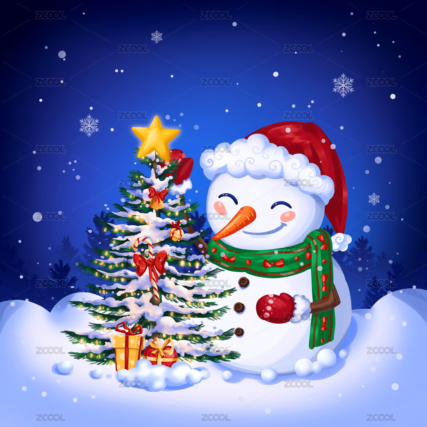 慶祝圣誕節(jié)的雪人和裝扮好的圣誕樹