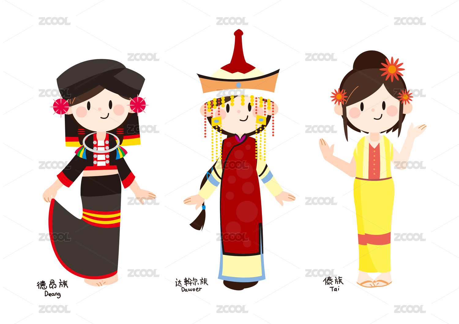 矢量可愛(ài)少數(shù)民族裝扮德昂族達(dá)斡爾族傣族