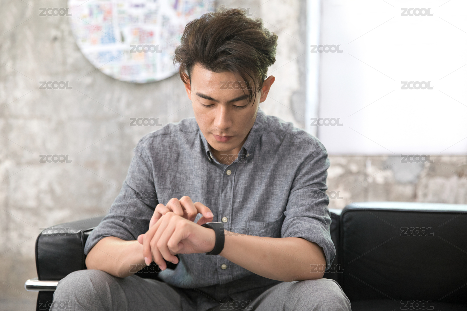 坐在沙發(fā)上的黃皮膚年輕男士正在查看戴在手上的商務(wù)手環(huán)