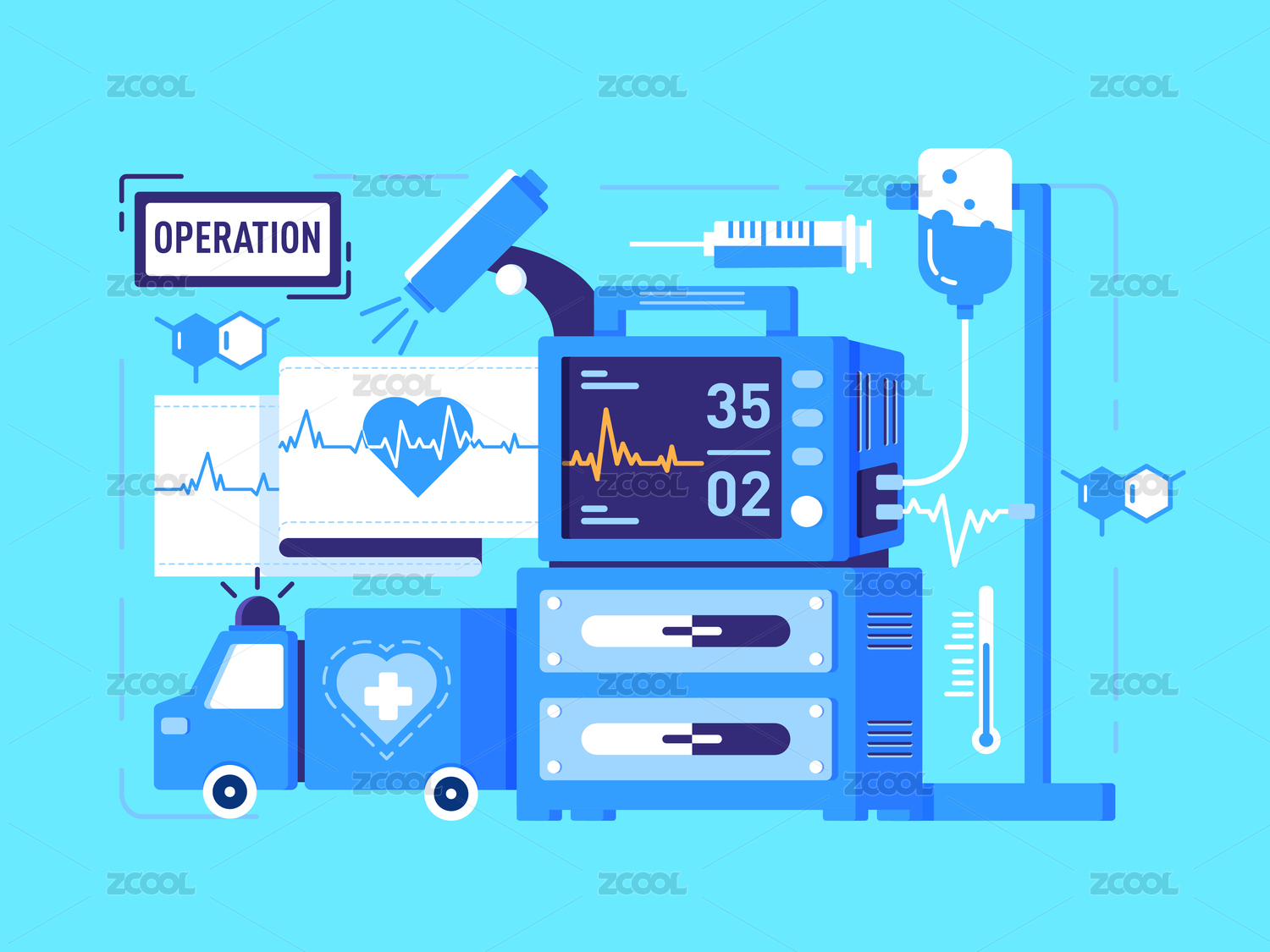 醫(yī)療心率儀器表救護(hù)車組合插畫