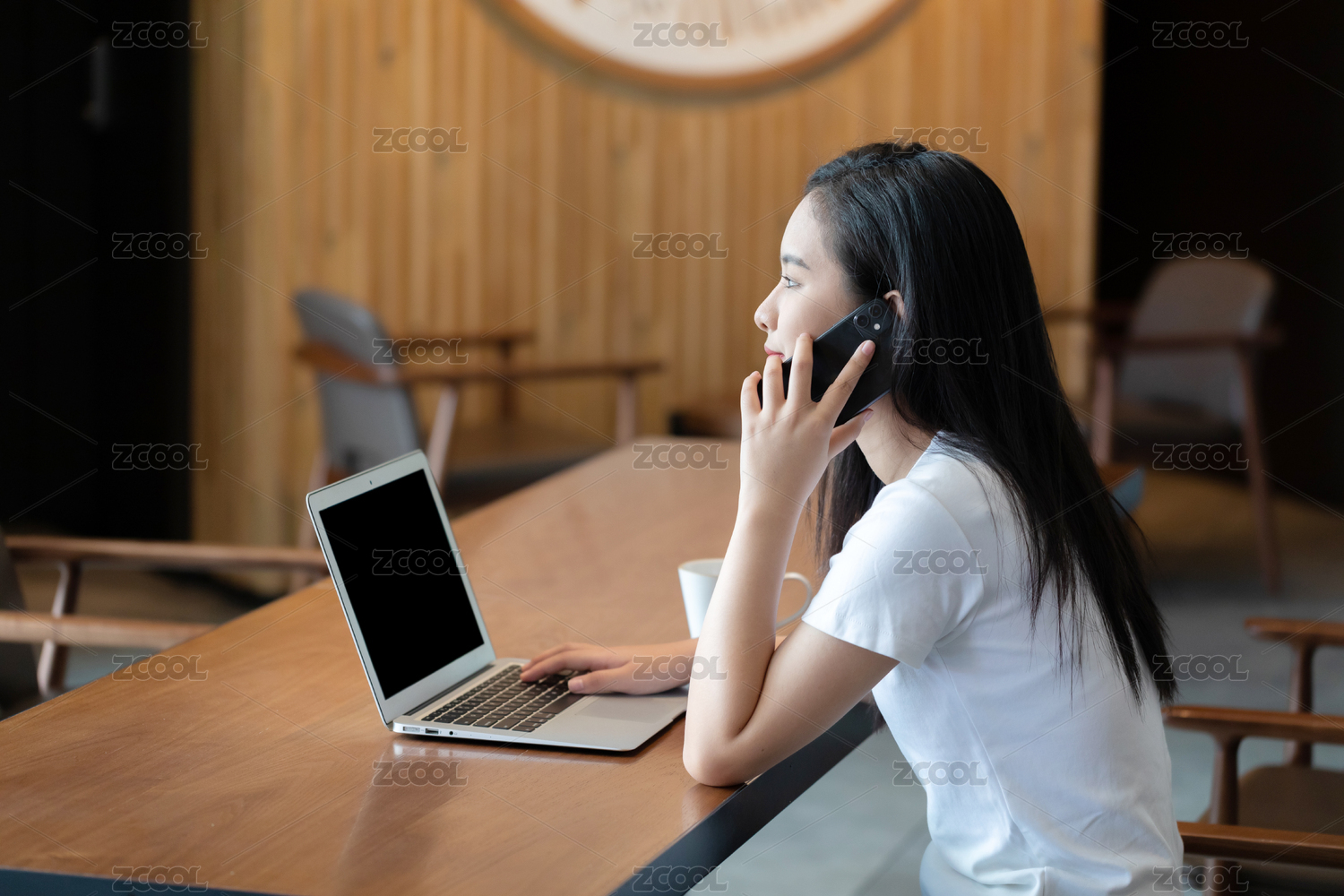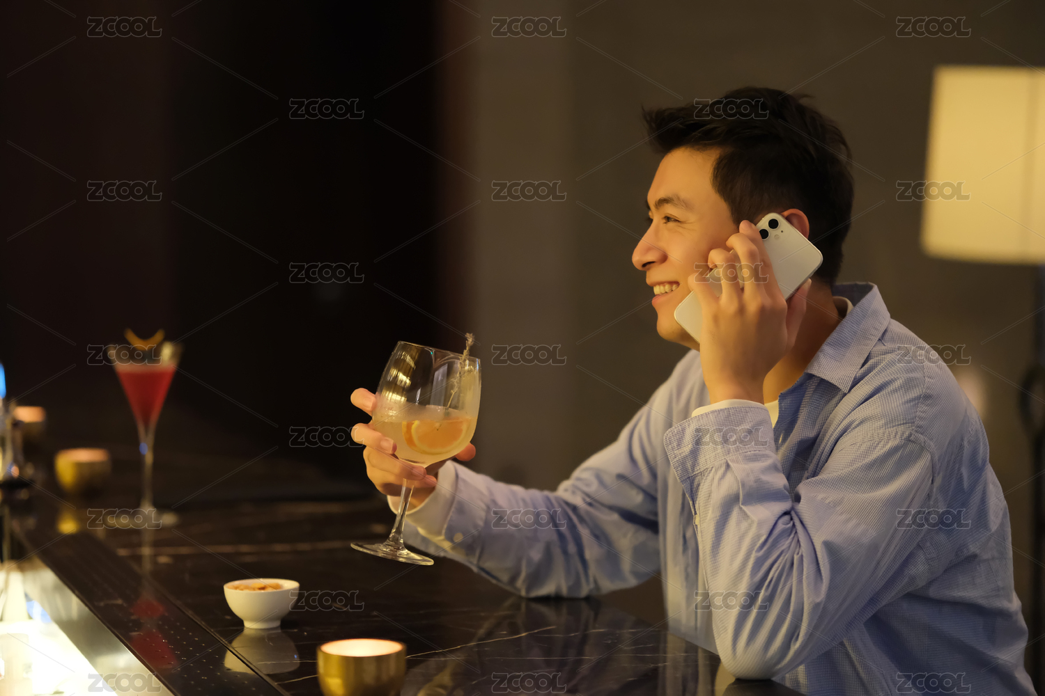 年輕的中國男人在夜晚的酒吧開心的打電話