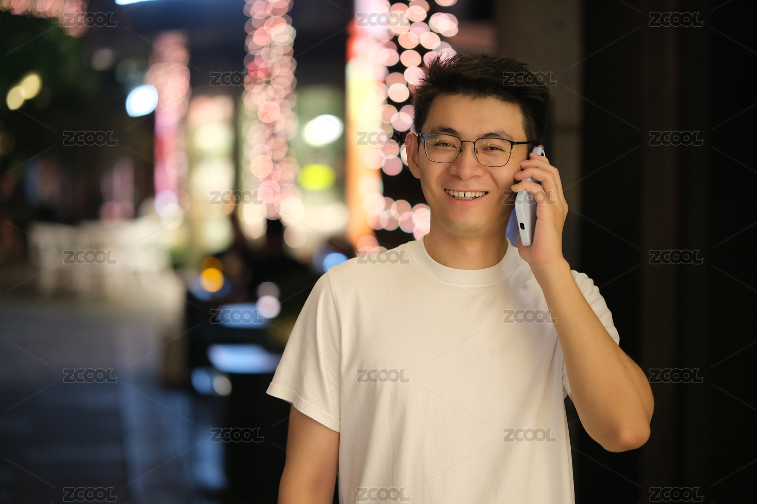 年輕中國男子在夜晚戶外街頭高興的打電話