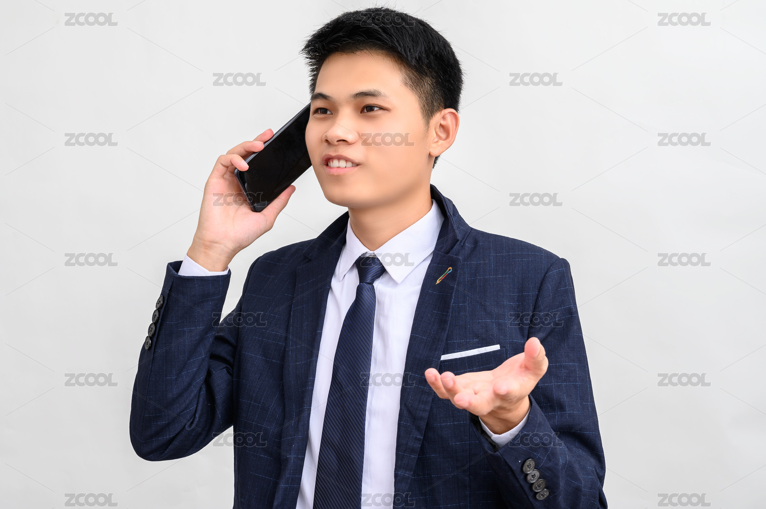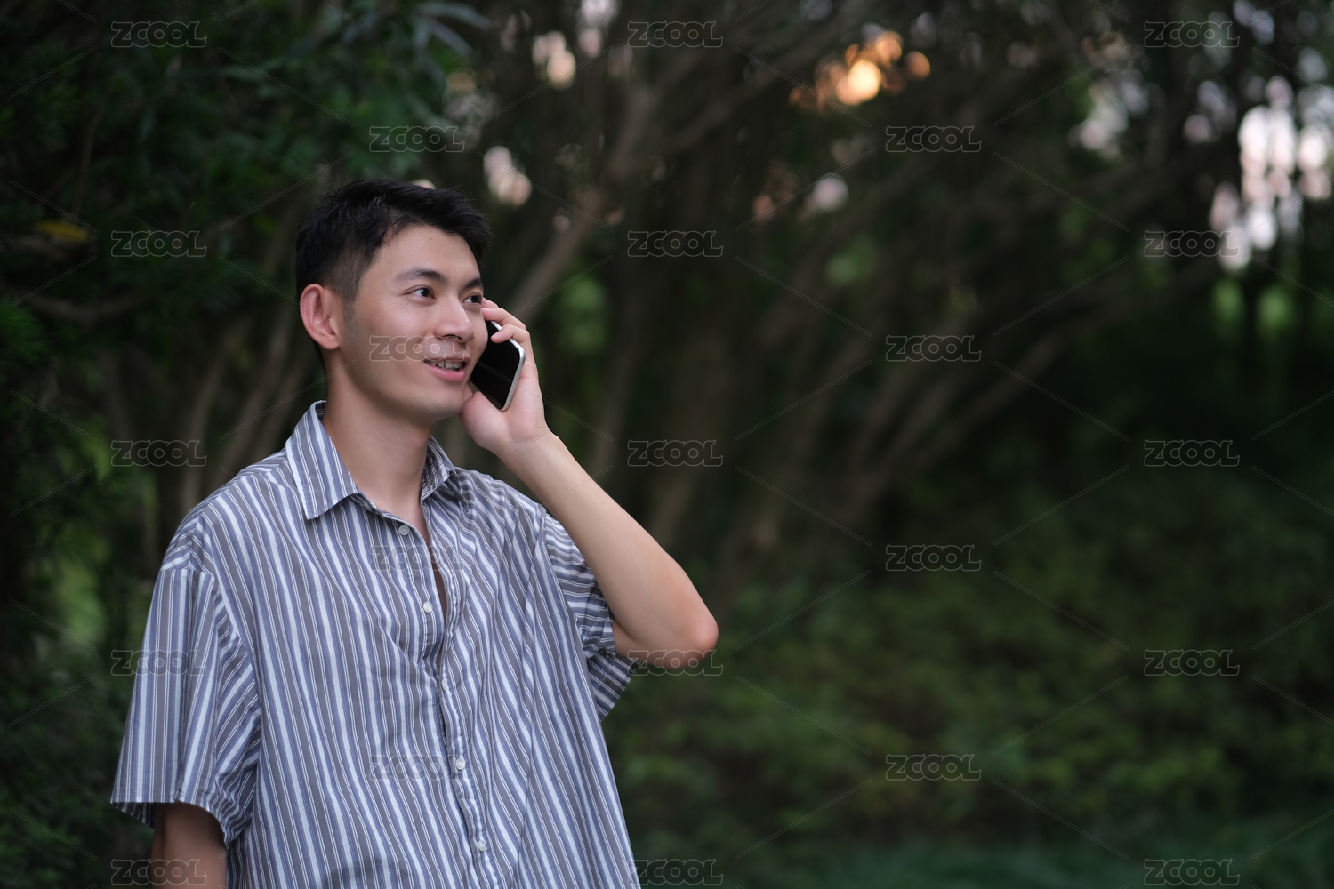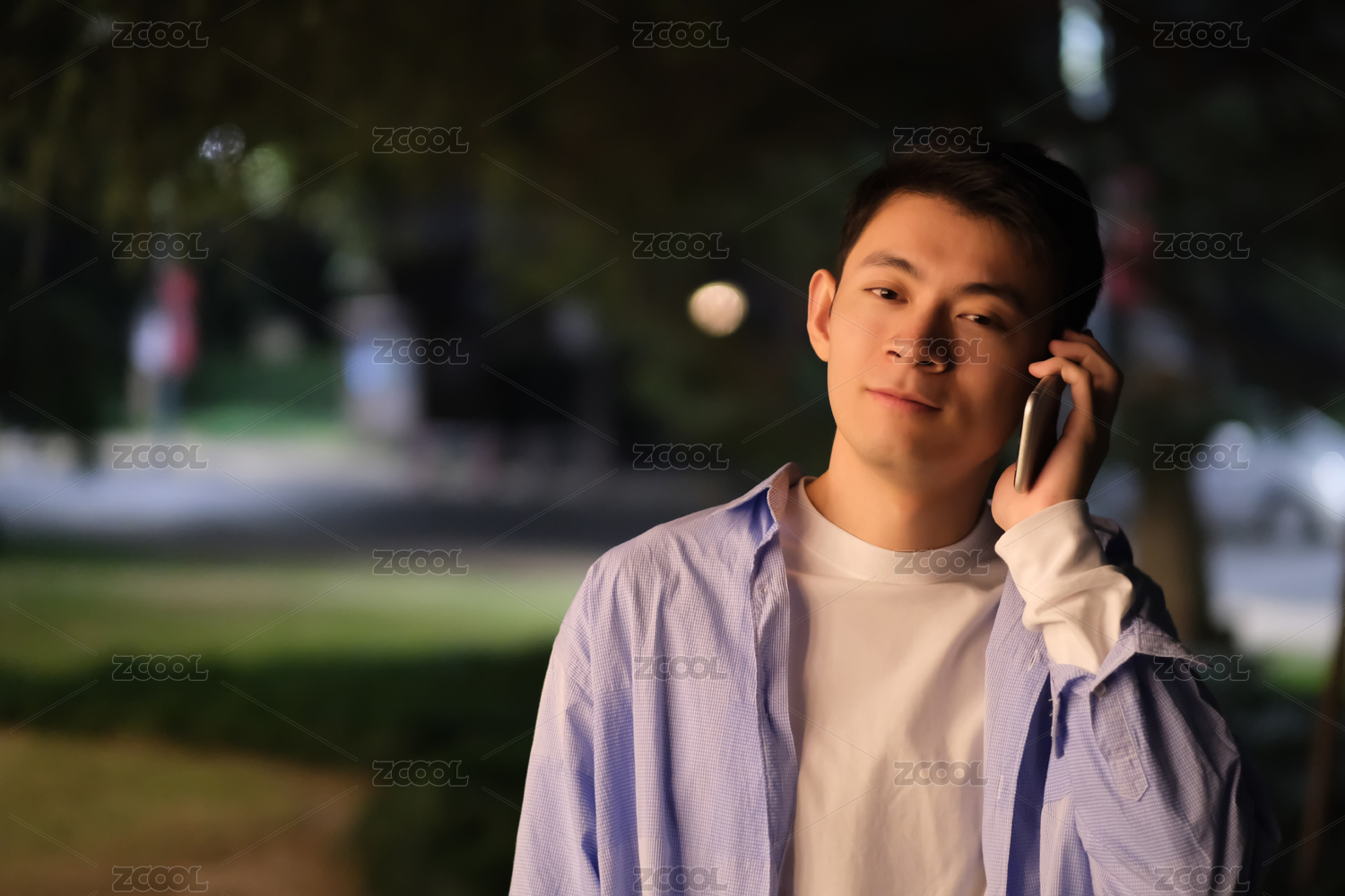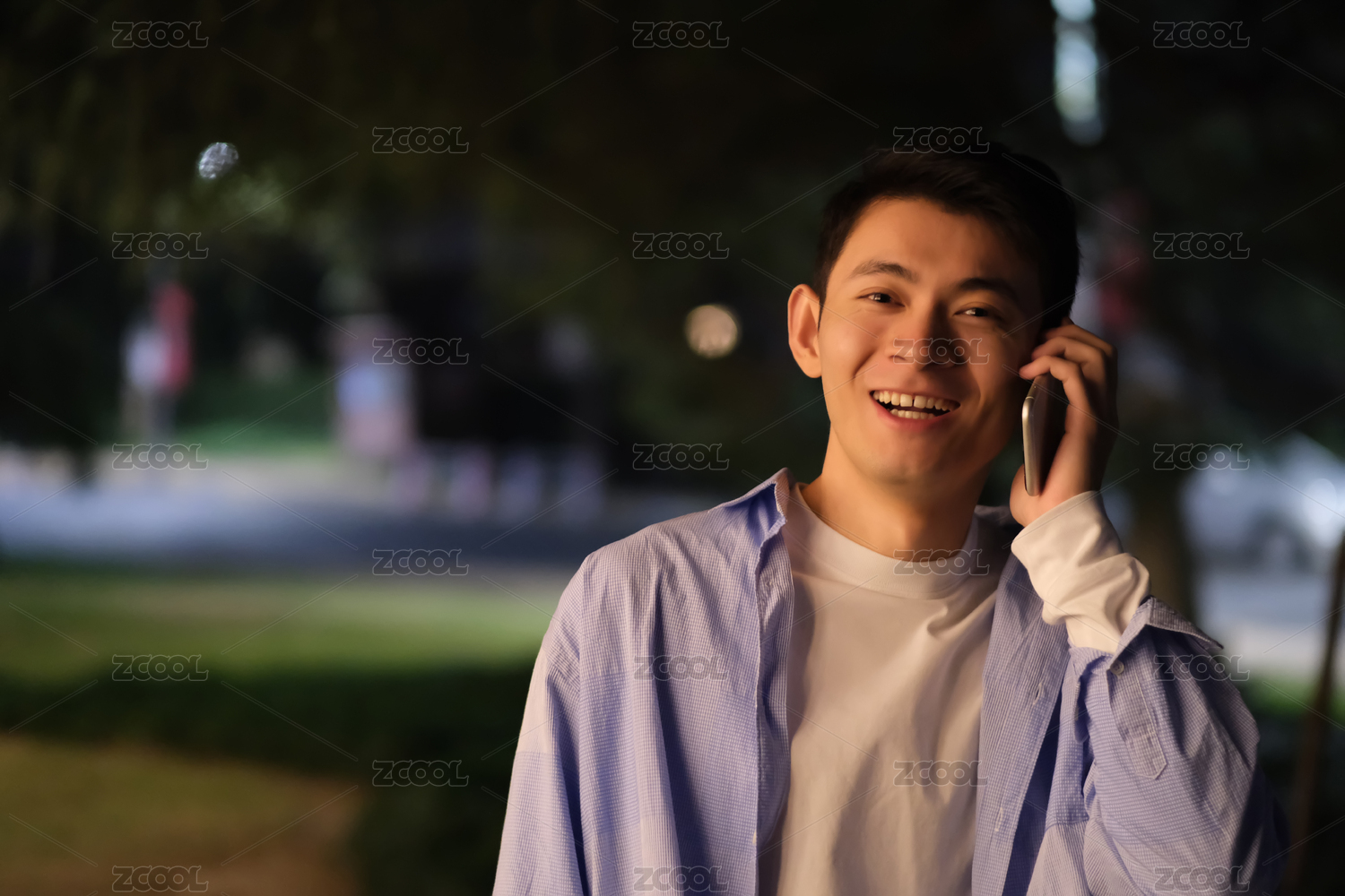英俊的中國年輕男子在戶外夜晚開心的打電話