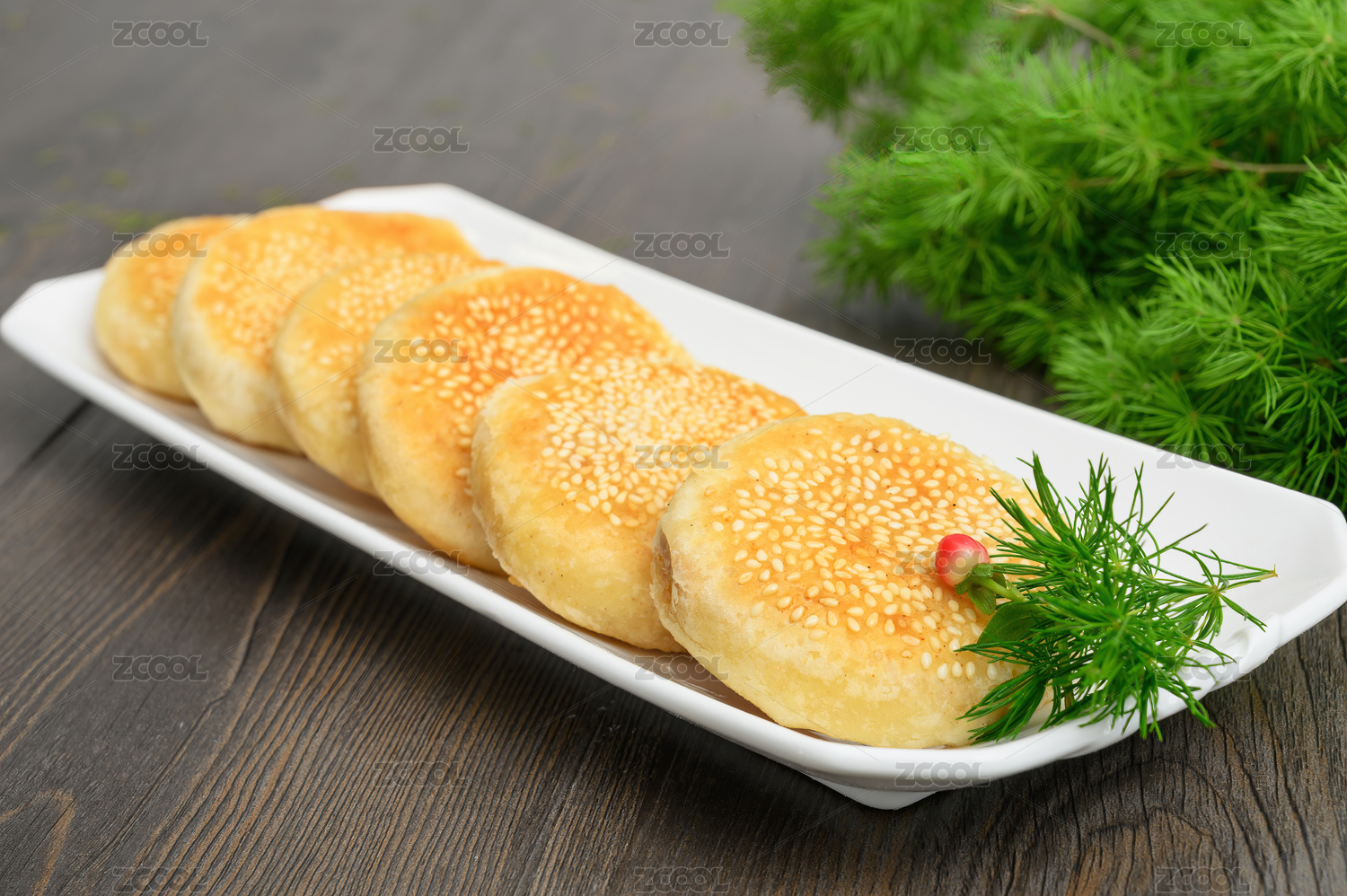 棕色木紋桌上放著一盤麻醬燒餅