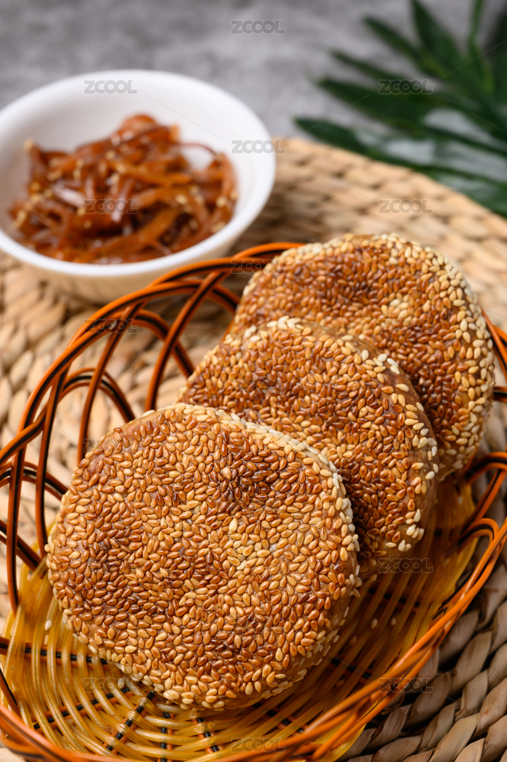 帶有漢字的餐布上放著一籃芝麻醬燒餅
