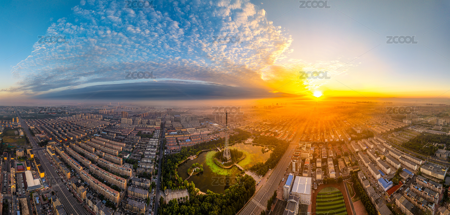 中國遼寧營口市鏡湖公園日出航拍全景