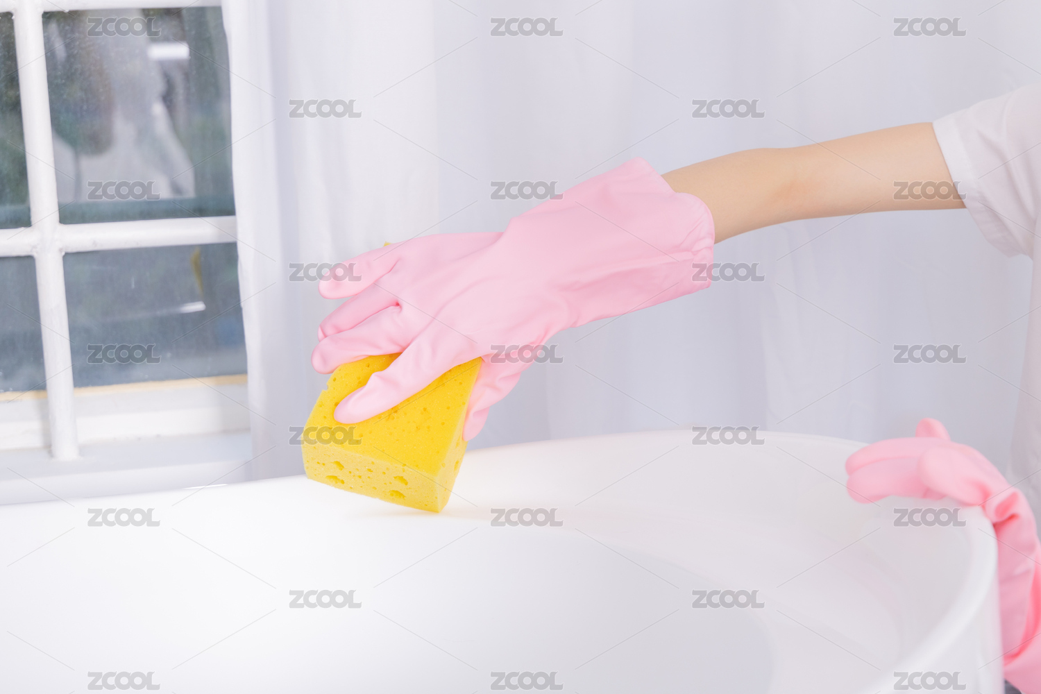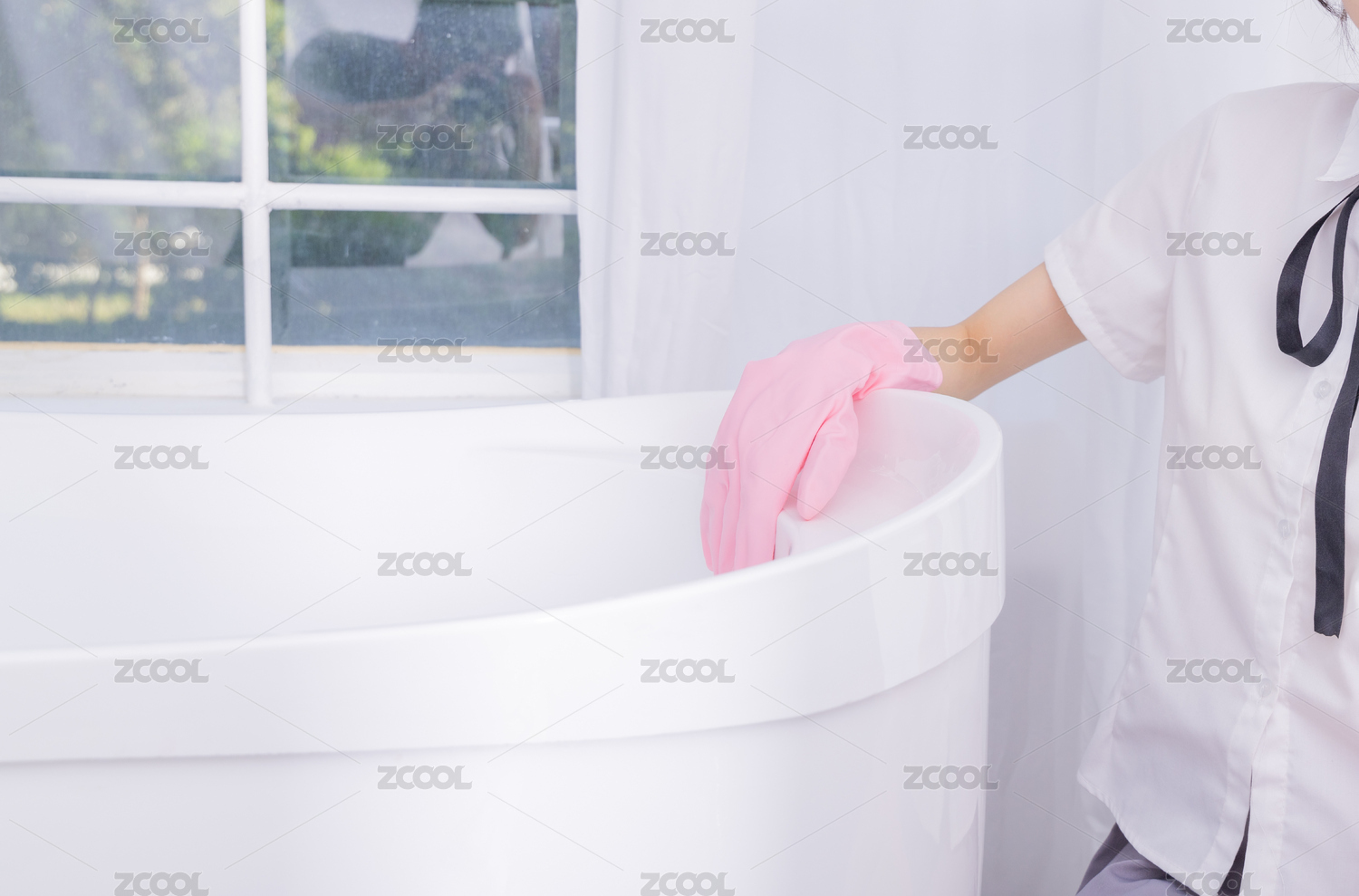 東方女性學(xué)生帶著手套清潔浴缸 打掃室內(nèi)衛(wèi)