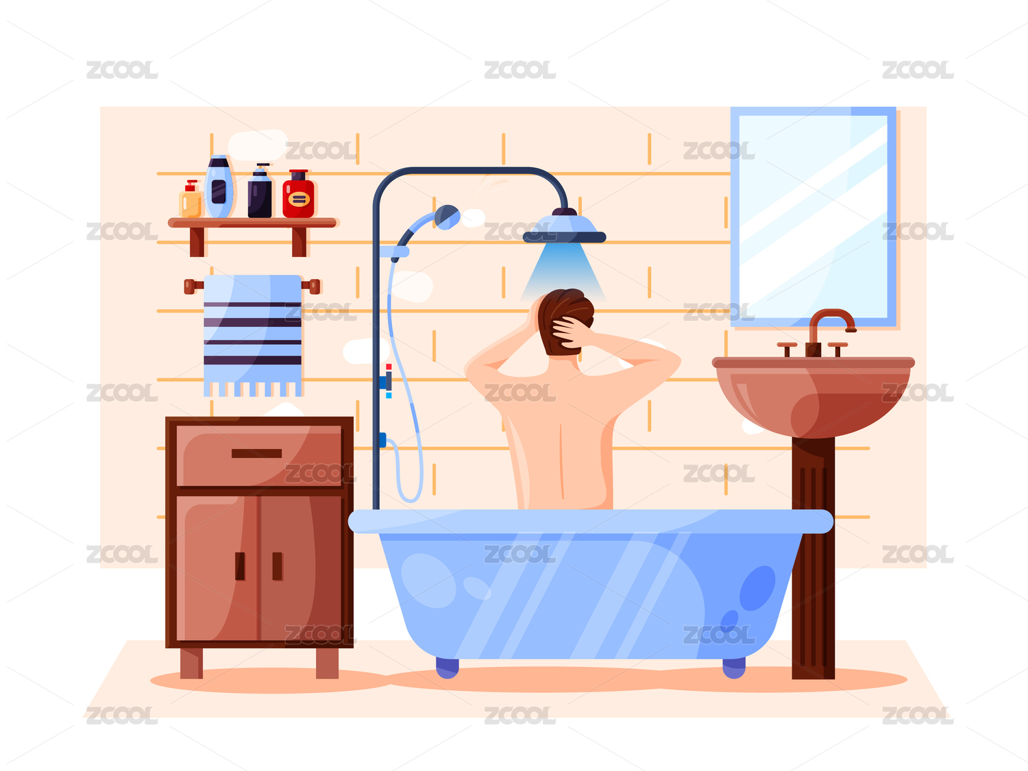 男子坐在浴缸里面洗澡矢量插畫